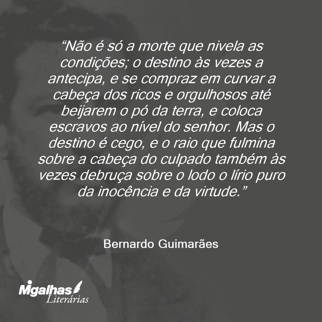 Não é só a morte que nivela as condições; o destino às vezes a antecipa, e se compraz em curvar a cabeça dos ricos e orgulhosos até beijarem o pó da terra, e coloca escravos ao nível do senhor. Mas o destino é cego, e o raio que fulmina sobre a cabeça do culpado também às vezes debruça sobre o lodo o lírio puro da inocência e da virtude.