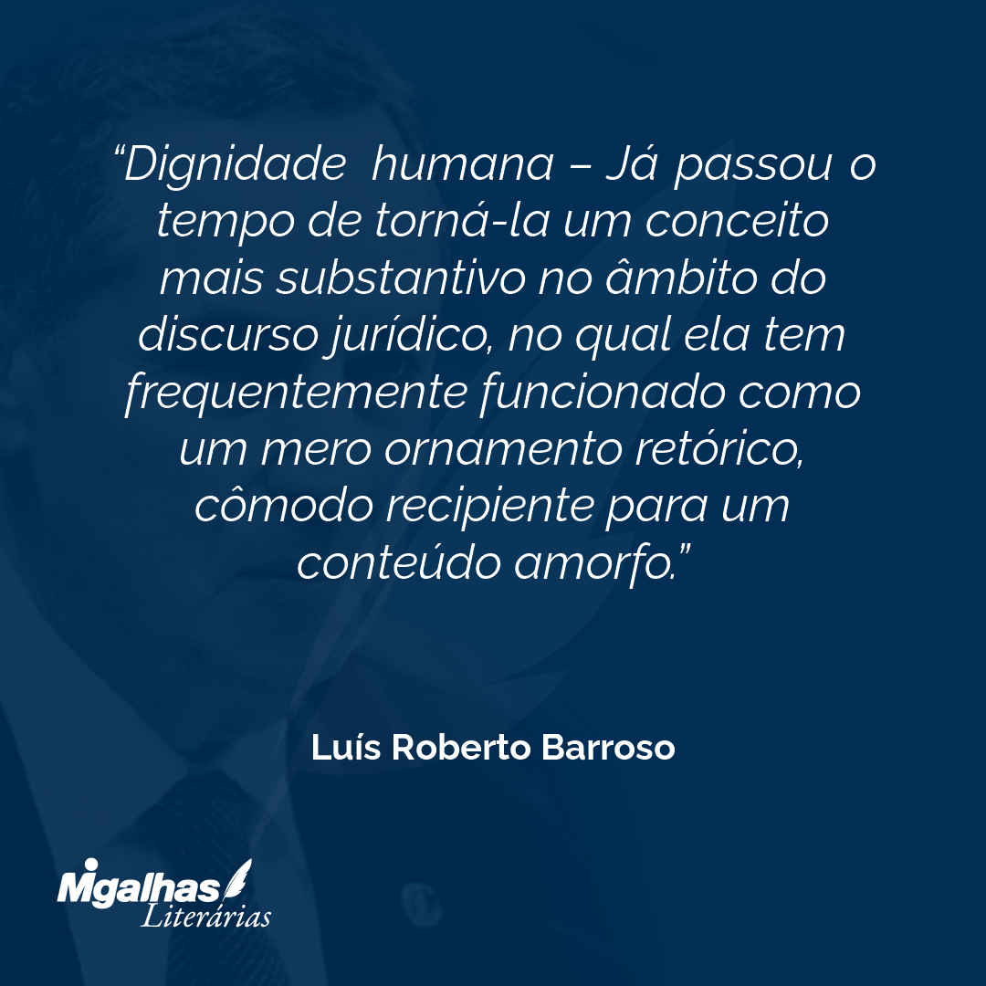 Dignidade humana – No plano abstrato, poucas ideias se equiparam a ela na capacidade de encantar o espírito e ganhar adesão unânime. Contudo, em termos práticos, a dignidade, como conceito jurídico, frequentemente funciona como um mero espelho, no qual cada um projeta os seus próprios valores.