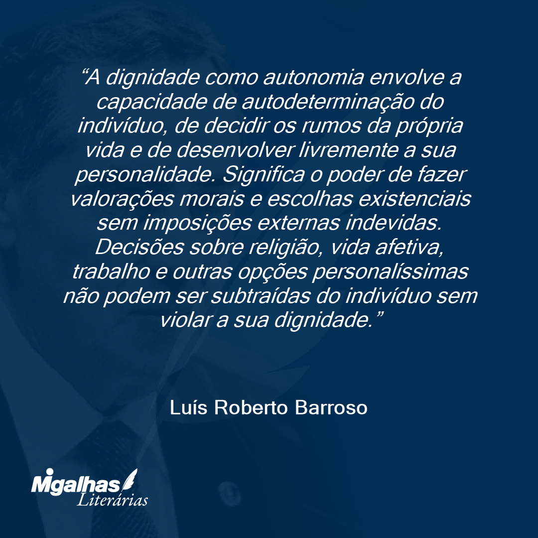 A dignidade como autonomia envolve a capacidade de autodeterminação do indivíduo, de decidir os rumos da própria vida e de desenvolver livremente a sua personalidade. Significa o poder de fazer valorações morais e escolhas existenciais sem imposições externas indevidas. Decisões sobre religião, vida afetiva, trabalho e outras opções personalíssimas não podem ser subtraídas do indivíduo sem violar a sua dignidade.
