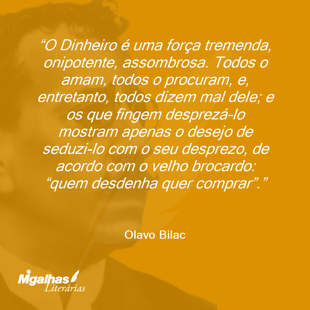 O Dinheiro é uma força tremenda, onipotente, assombrosa. Todos o amam, todos o procuram, e, entretanto, todos dizem mal dele; e os que fingem desprezá-lo mostram apenas o desejo de seduzi-lo com o seu desprezo, de acordo com o velho brocardo: “quem desdenha quer comprar”.