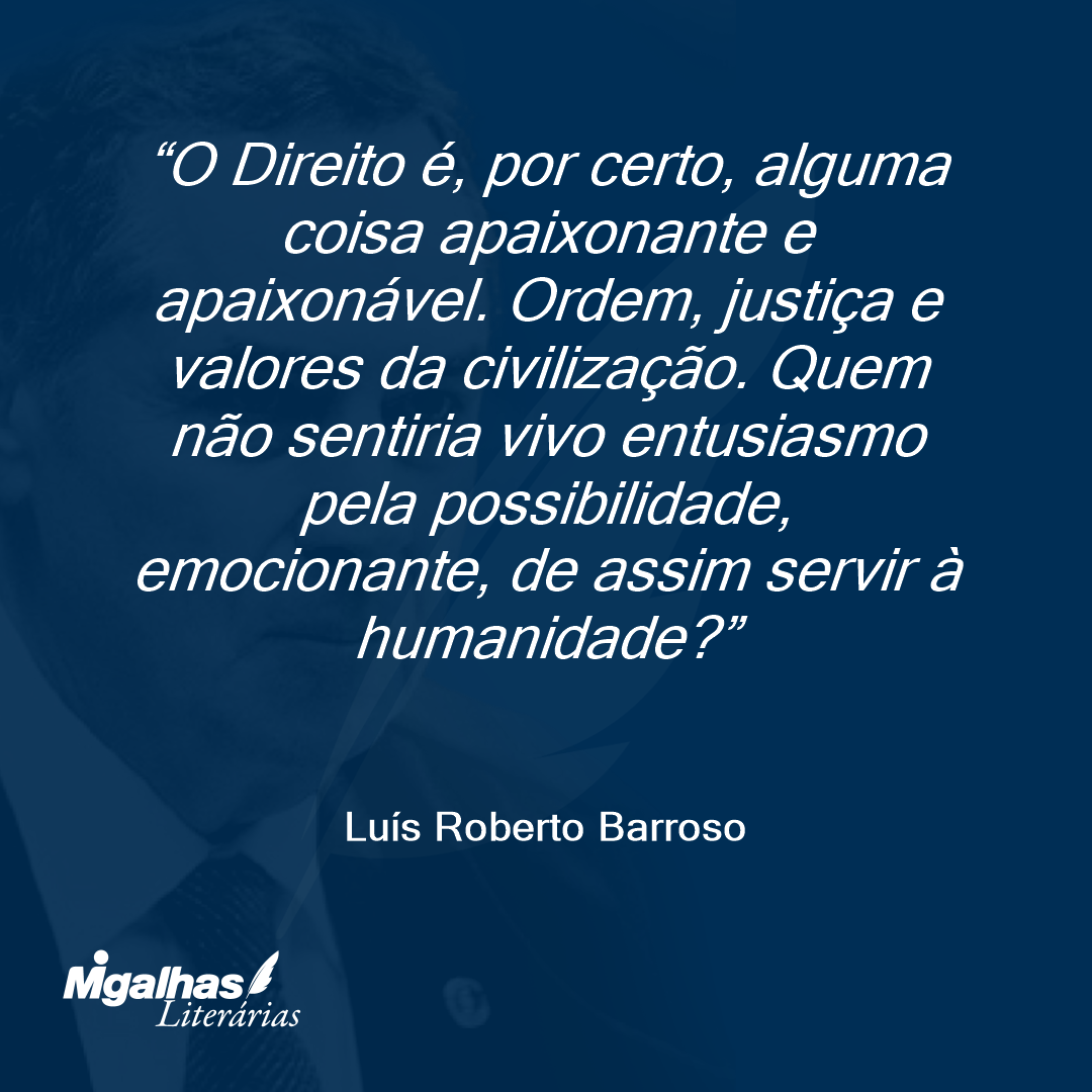 O Direito é, por certo, alguma coisa apaixonante e apaixonável. Ordem, justiça e valores da civilização. Quem não sentiria vivo entusiasmo pela possibilidade, emocionante, de assim servir à humanidade?