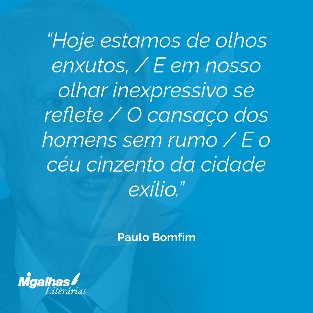 Hoje estamos de olhos enxutos, / E em nosso olhar inexpressivo se reflete / O cansaço dos homens sem rumo / E o céu cinzento da cidade exílio.