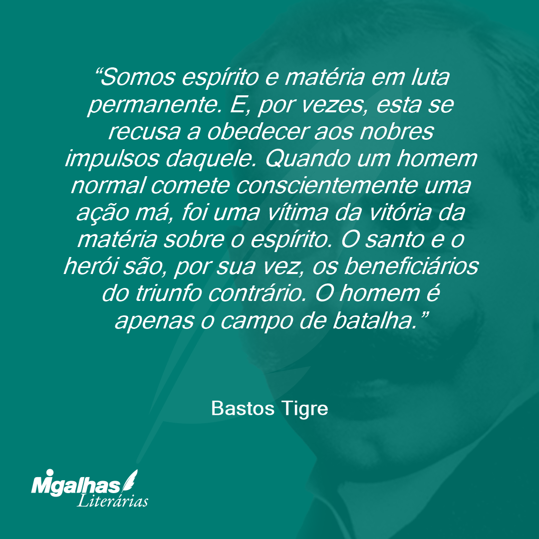 Somos espírito e matéria em luta permanente. E, por vezes, esta se recusa a obedecer aos nobres impulsos daquele. Quando um homem normal comete conscientemente uma ação má, foi uma vítima da vitória da matéria sobre o espírito. O santo e o herói são, por sua vez, os beneficiários do triunfo contrário. O homem é apenas o campo de batalha.