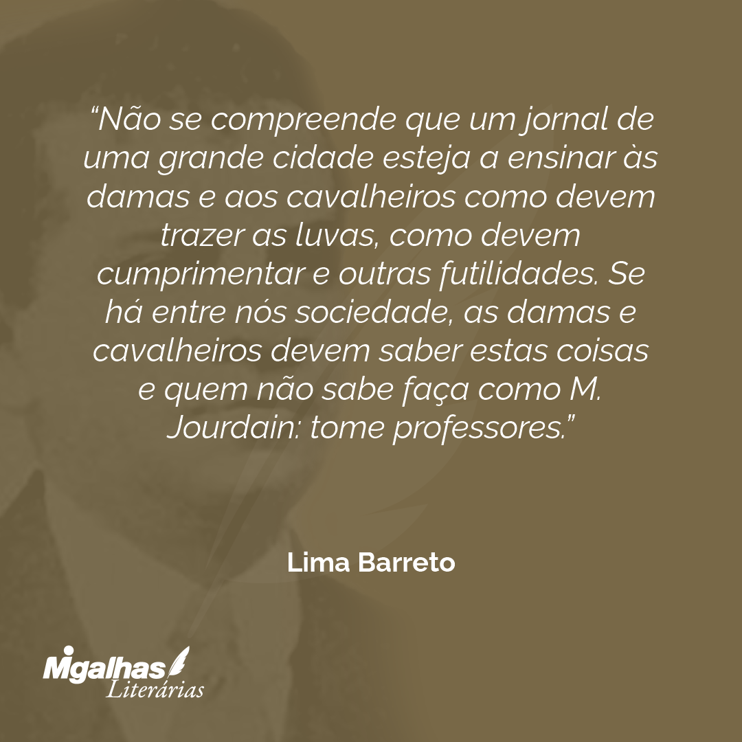 Não se compreende que um jornal de uma grande cidade esteja a ensinar às damas e aos cavalheiros como devem trazer as luvas, como devem cumprimentar e outras futilidades. Se há entre nós sociedade, as damas e cavalheiros devem saber estas coisas e quem não sabe faça como M. Jourdain: tome professores.
