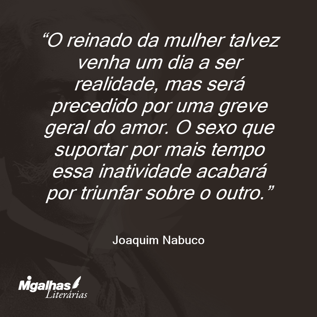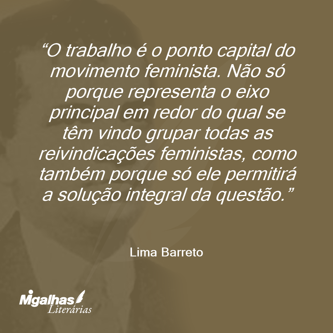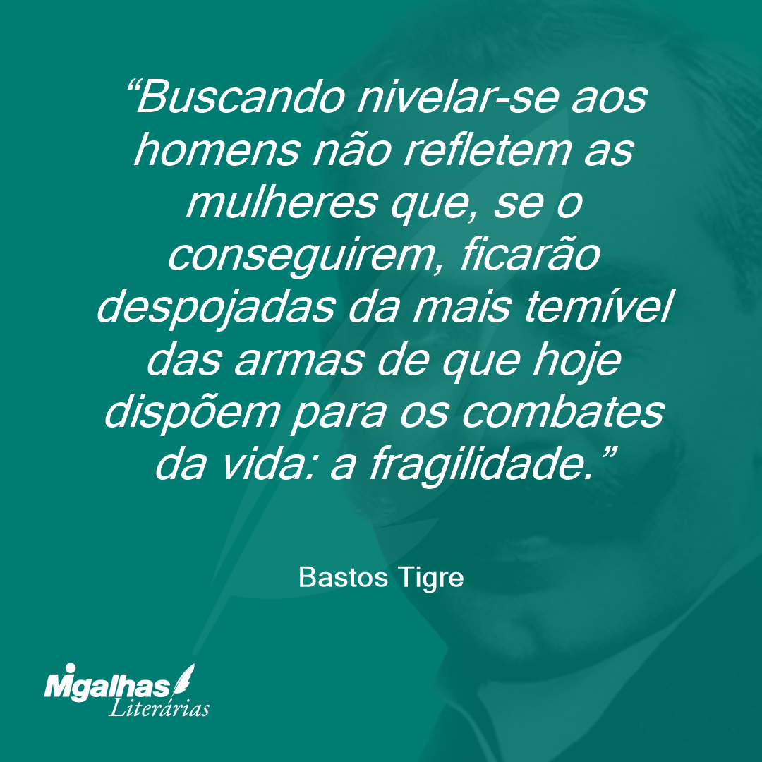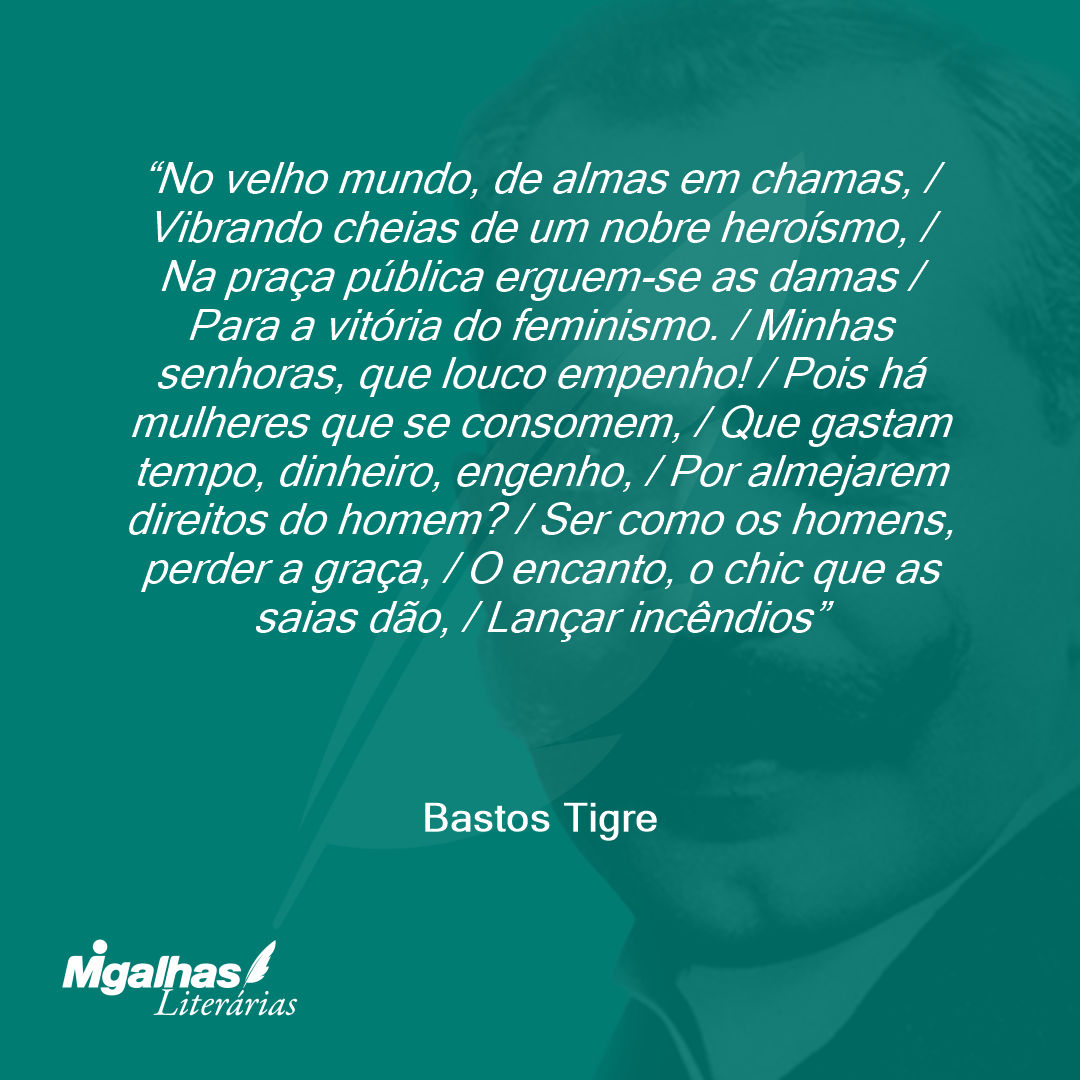 No velho mundo, de almas em chamas, / Vibrando cheias de um nobre heroísmo, / Na praça pública erguem-se as damas / Para a vitória do feminismo. / Minhas senhoras, que louco empenho! / Pois há mulheres que se consomem, / Que gastam tempo, dinheiro, engenho, / Por almejarem direitos do homem? / Ser como os homens, perder a graça, / O encanto, o chic que as saias dão, / Lançar incêndios