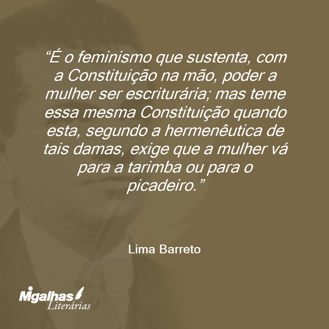 É o feminismo que sustenta, com a Constituição na mão, poder a mulher ser escriturária; mas teme essa mesma Constituição quando esta, segundo a hermenêutica de tais damas, exige que a mulher vá para a tarimba ou para o picadeiro.