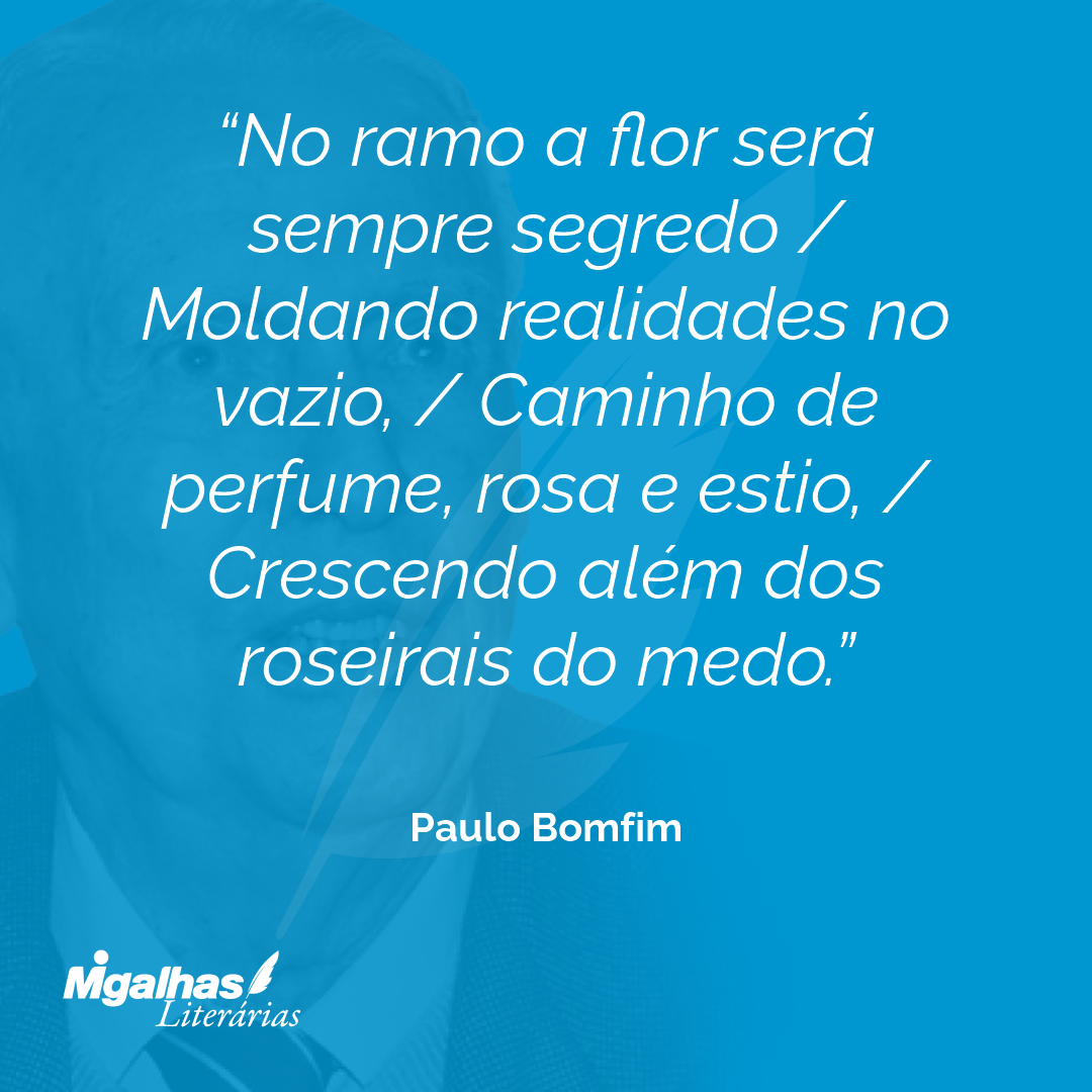 No ramo a flor será sempre segredo / Moldando realidades no vazio, / Caminho de perfume, rosa e estio, / Crescendo além dos roseirais do medo.