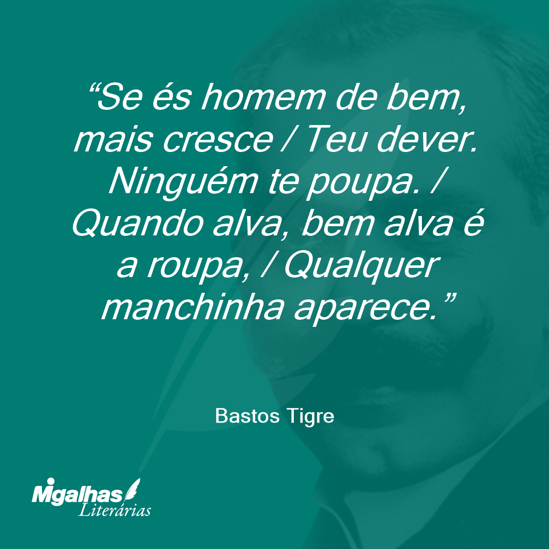 Se és homem de bem, mais cresce / Teu dever. Ninguém te poupa. / Quando alva, bem alva é a roupa, / Qualquer manchinha aparece.