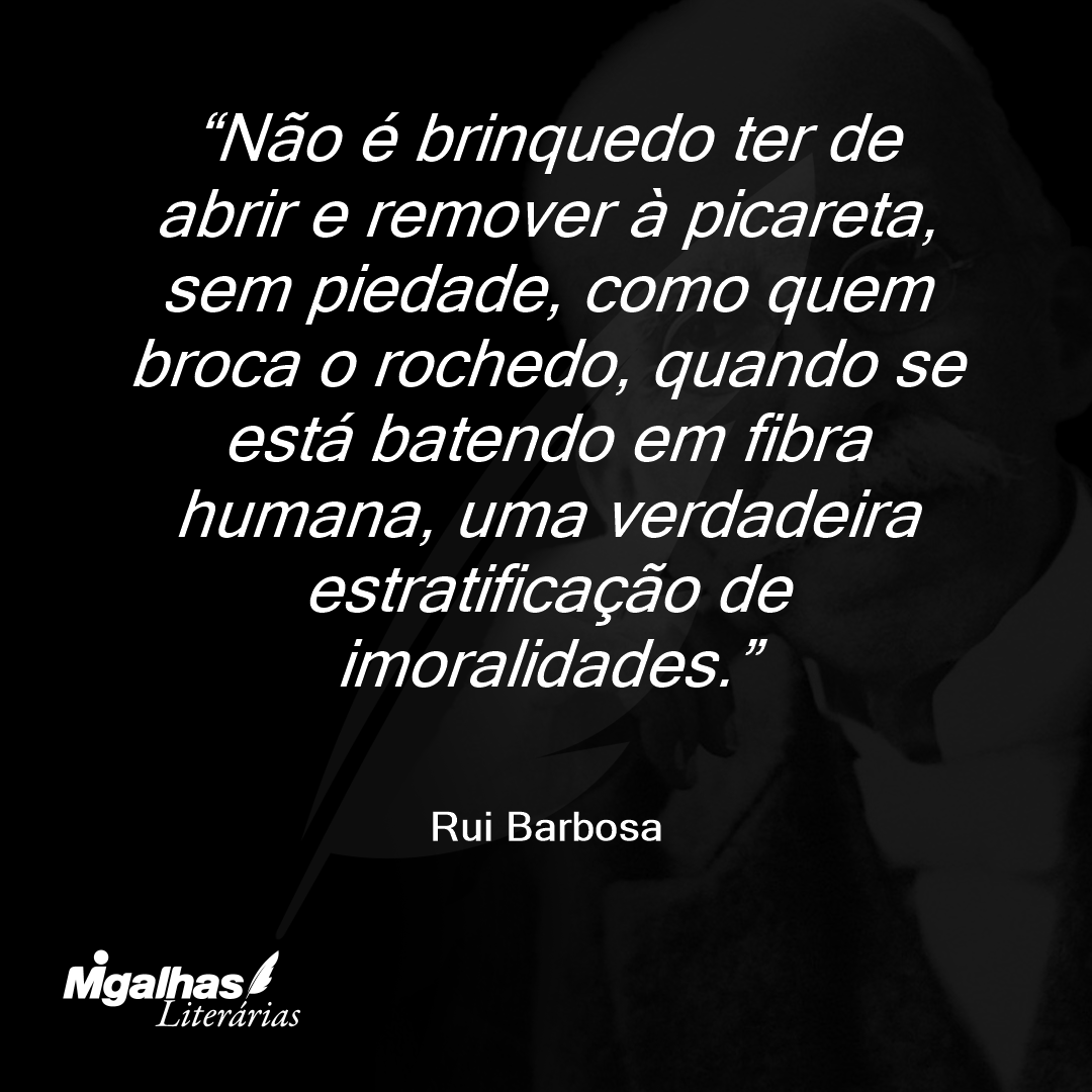 Não é brinquedo ter de abrir e remover à picareta, sem piedade, como quem broca o rochedo, quando se está batendo em fibra humana, uma verdadeira estratificação de imoralidades.
