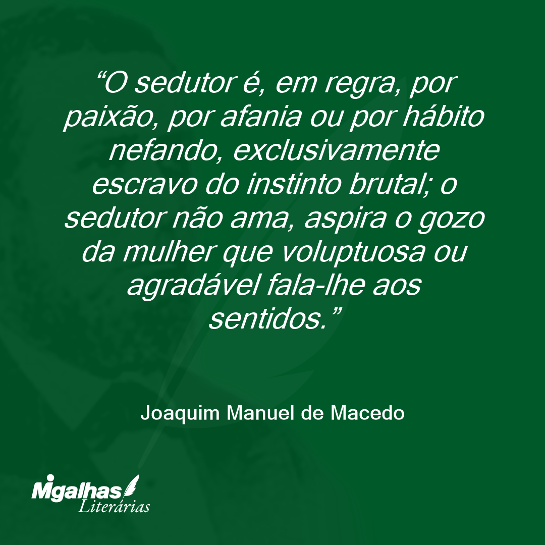 O sedutor é, em regra, por paixão, por afania ou por hábito nefando, exclusivamente escravo do instinto brutal; o sedutor não ama, aspira o gozo da mulher que voluptuosa ou agradável fala-lhe aos sentidos.