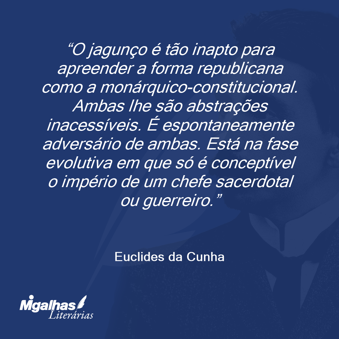 O jagunço é tão inapto para apreender a forma republicana como a monárquico-constitucional. Ambas lhe são abstrações inacessíveis. É espontaneamente adversário de ambas. Está na fase evolutiva em que só é conceptível o império de um chefe sacerdotal ou guerreiro.
