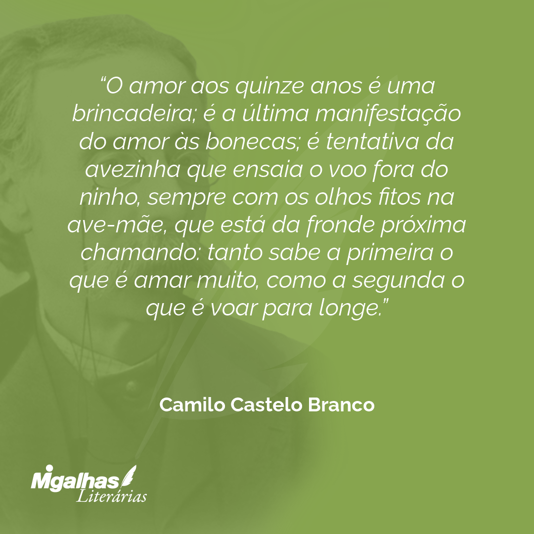 O amor aos quinze anos é uma brincadeira; é a última manifestação do amor às bonecas; é tentativa da avezinha que ensaia o voo fora do ninho, sempre com os olhos fitos na ave-mãe, que está da fronde próxima chamando: tanto sabe a primeira o que é amar muito, como a segunda o que é voar para longe.