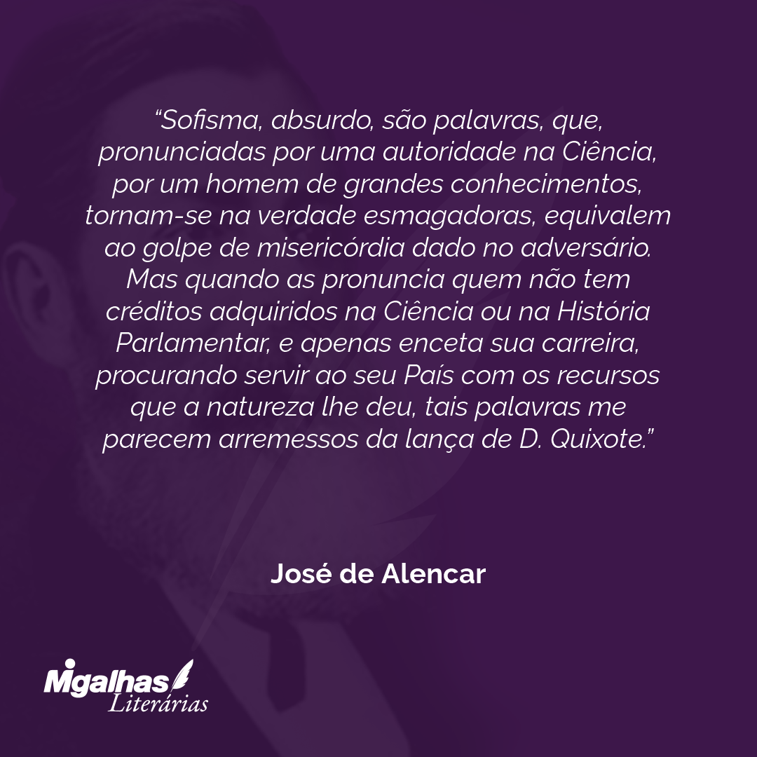 Sofisma, absurdo, são palavras, que, pronunciadas por uma autoridade na Ciência, por um homem de grandes conhecimentos, tornam-se na verdade esmagadoras, equivalem ao golpe de misericórdia dado no adversário. Mas quando as pronuncia quem não tem créditos adquiridos na Ciência ou na História Parlamentar, e apenas enceta sua carreira, procurando servir ao seu País com os recursos que a natureza lhe deu, tais palavras me parecem arremessos da lança de D. Quixote.