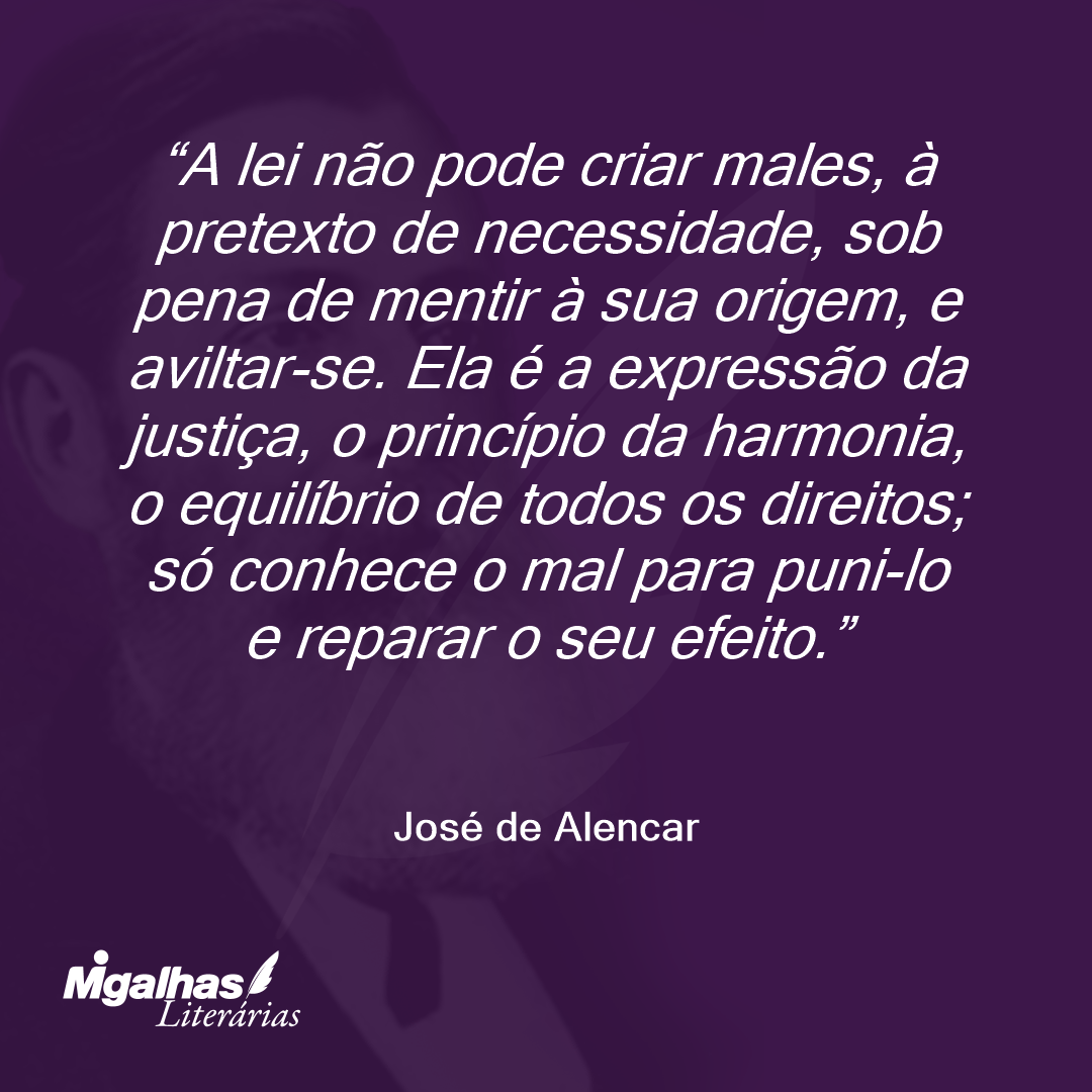 A lei não pode criar males, à pretexto de necessidade, sob pena de mentir à sua origem, e aviltar-se. Ela é a expressão da justiça, o princípio da harmonia, o equilíbrio de todos os direitos; só conhece o mal para puni-lo e reparar o seu efeito.