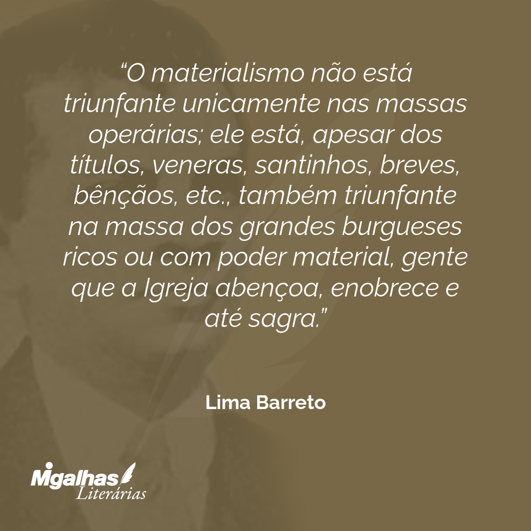 O materialismo não está triunfante unicamente nas massas operárias; ele está, apesar dos títulos, veneras, santinhos, breves, bênçãos, etc., também triunfante na massa dos grandes burgueses ricos ou com poder material, gente que a Igreja abençoa, enobrece e até sagra.