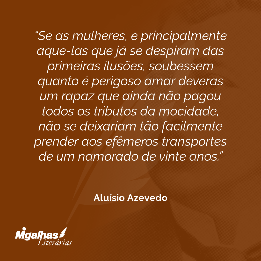 Se as mulheres, e principalmente aque-las que já se despiram das primeiras ilusões, soubessem quanto é perigoso amar deveras um rapaz que ainda não pagou todos os tributos da mocidade, não se deixariam tão facilmente prender aos efêmeros transportes de um namorado de vinte anos.