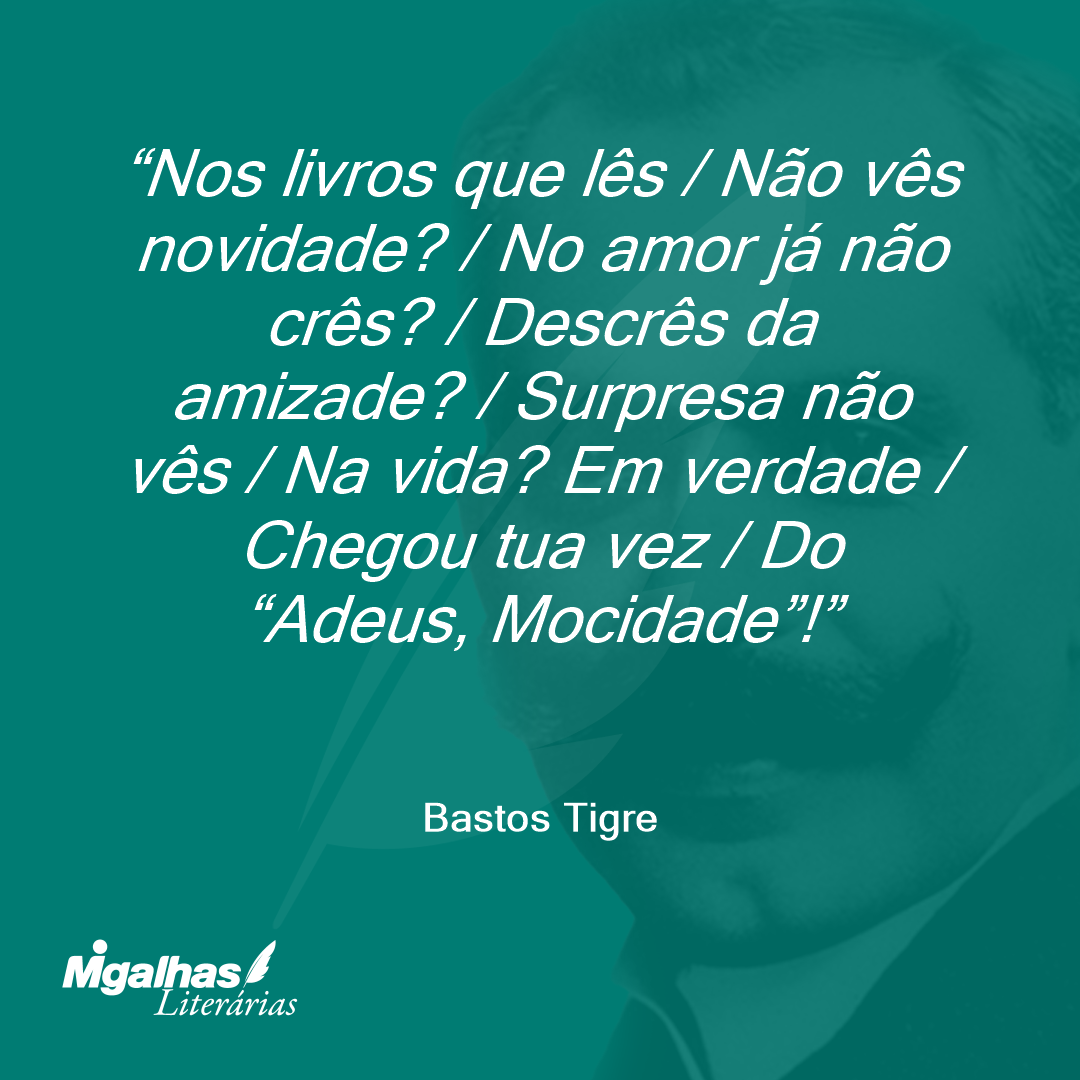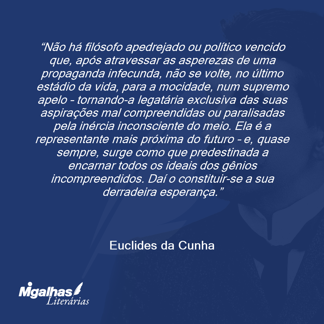 Não há filósofo apedrejado ou político vencido que, após atravessar as asperezas de uma propaganda infecunda, não se volte, no último estádio da vida, para a mocidade, num supremo apelo – tornando-a legatária exclusiva das suas aspirações mal compreendidas ou paralisadas pela inércia inconsciente do meio. Ela é a representante mais próxima do futuro – e, quase sempre, surge como que predestinada a encarnar todos os ideais dos gênios incompreendidos. Daí o constituir-se a sua derradeira esperança.