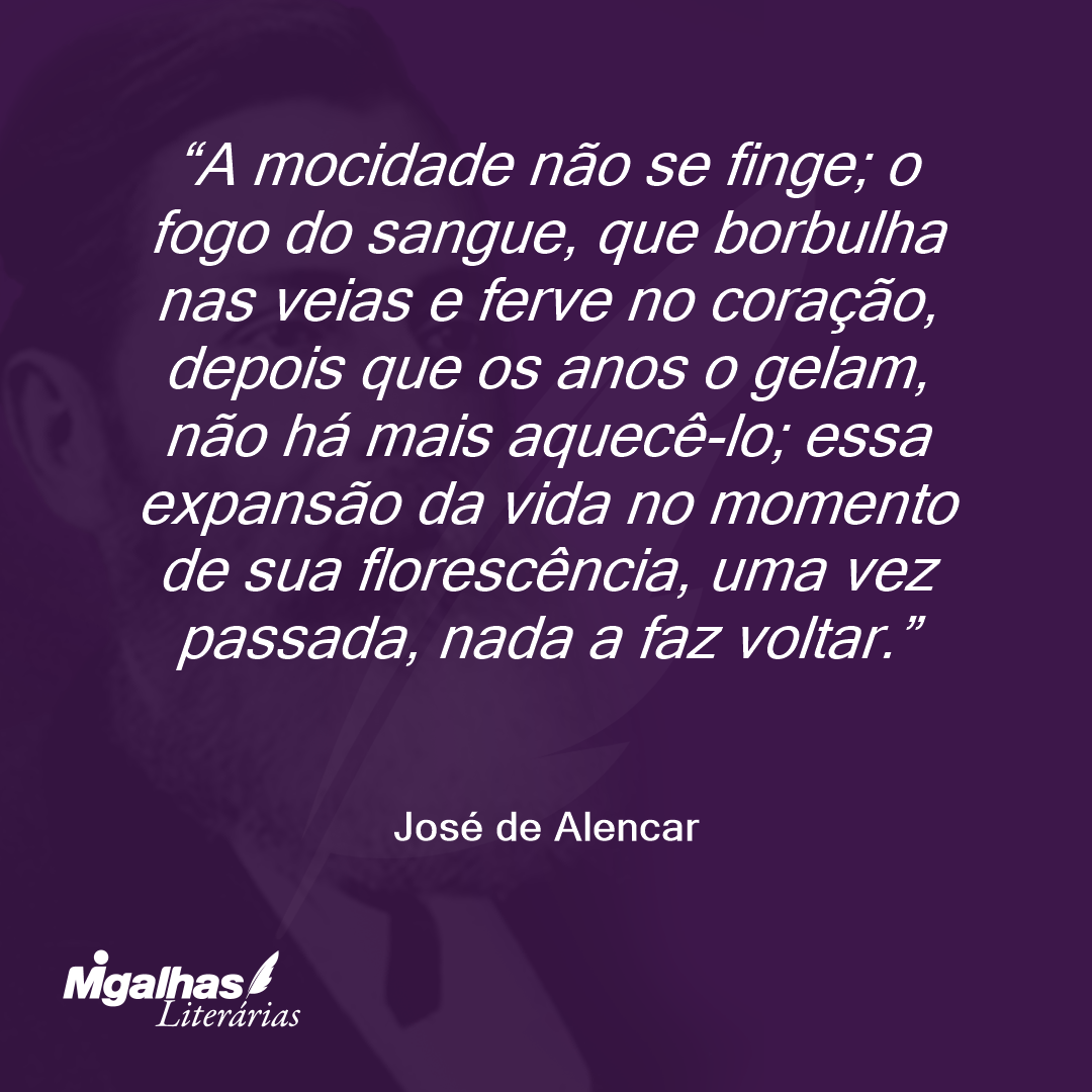 Mocidade, ama! Na vertigem louca / De candentes beijos, de febril paixão, / Vê que o Amor é imenso quanto a Vida é pouca; / Toda a vez que um beijo vai de boca a boca, / Pelo tempo as eras se alongando vão! / Sofre, Mocidade, pelo Amor! Mas ama, / Sempre, mais ainda, por teu próprio bem! / Guarda sempre viva, rebrilhante, a chama / Que tua alma queima, que teu corpo inflama, / Produzindo vida que da Vida vem! / Mocidade, sonha! Faz a vida ao jeito / Do teu rubro anseio, do teu nobre ideal! / Sonha! Do que o sonho nada há mais perfeito. / Tudo quanto é belo pelo sonho é feito; / Vem da realidade tudo quanto é mal.