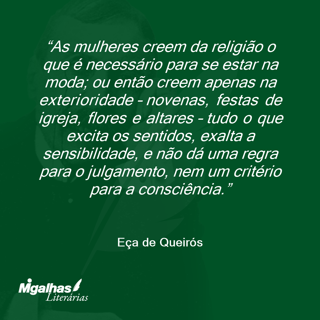 As mulheres creem da religião o que é necessário para se estar na moda; ou então creem apenas na exterioridade – novenas, festas de igreja, flores e altares – tudo o que excita os sentidos, exalta a sensibilidade, e não dá uma regra para o julgamento, nem um critério para a consciência.