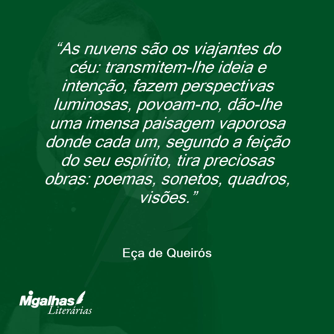 As nuvens são os viajantes do céu: transmitem-lhe ideia e intenção, fazem perspectivas luminosas, povoam-no, dão-lhe uma imensa paisagem vaporosa donde cada um, segundo a feição do seu espírito, tira preciosas obras: poemas, sonetos, quadros, visões.