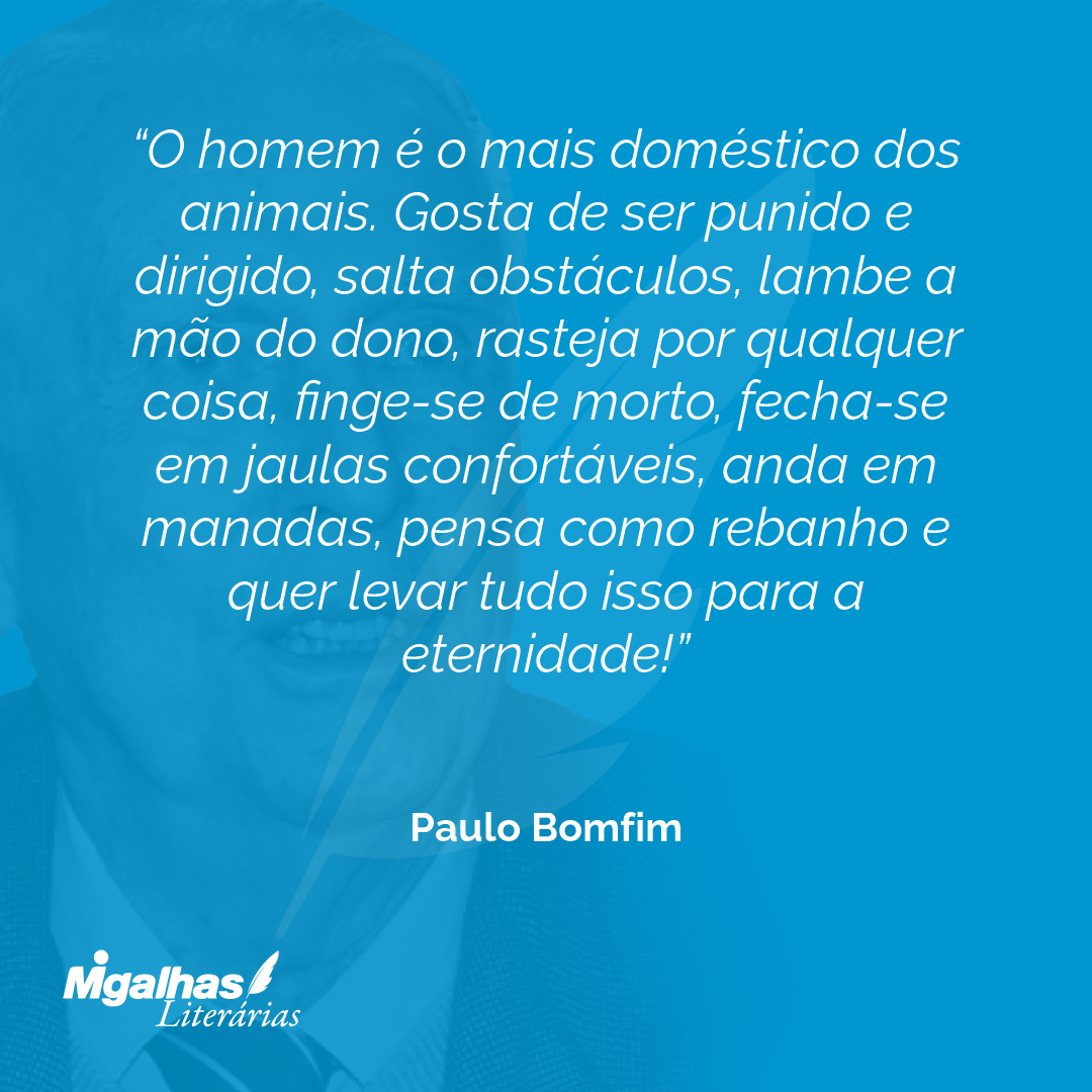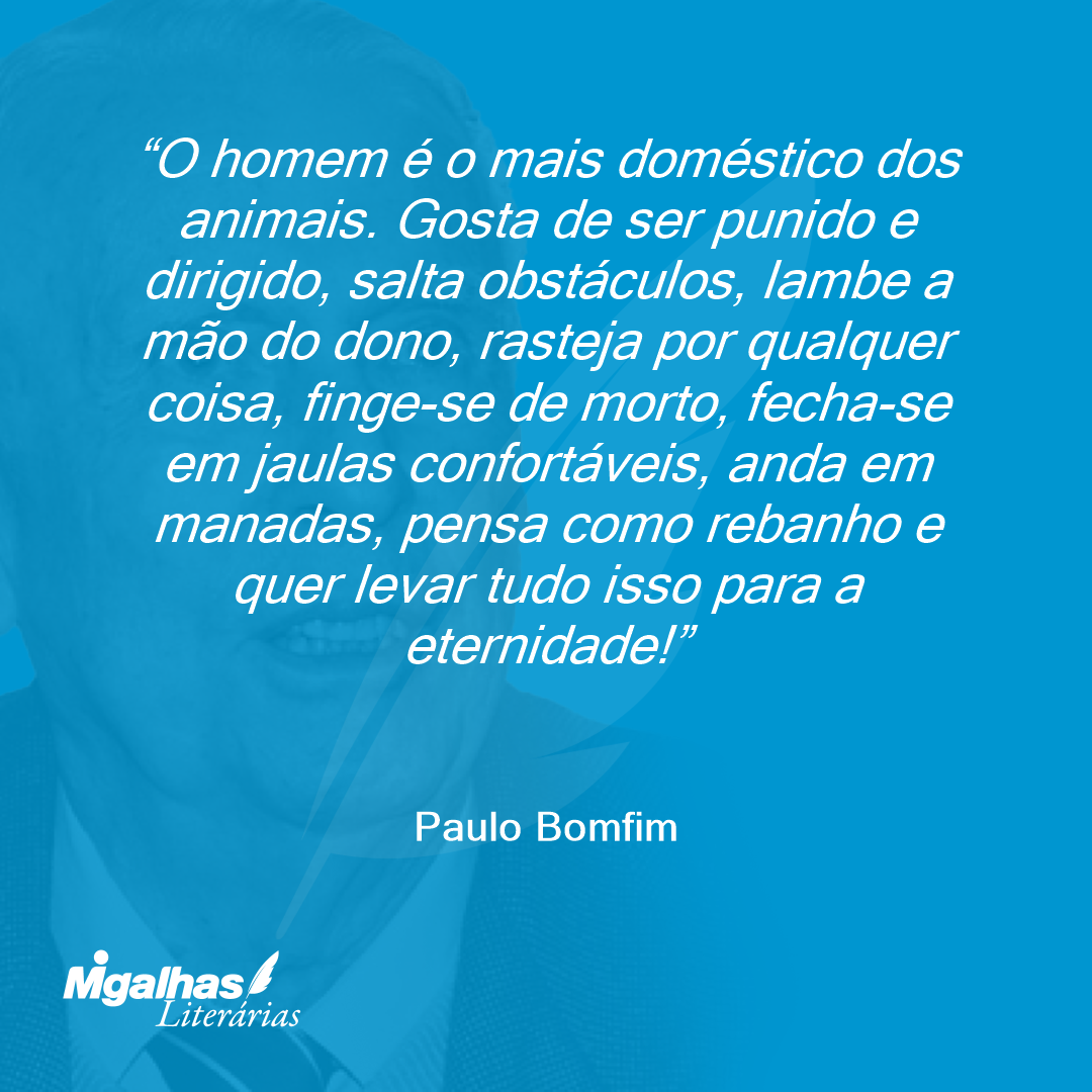 O homem é o mais doméstico dos animais. Gosta de ser punido e dirigido, salta obstáculos, lambe a mão do dono, rasteja por qualquer coisa, finge-se de morto, fecha-se em jaulas confortáveis, anda em manadas, pensa como rebanho e quer levar tudo isso para a eternidade!