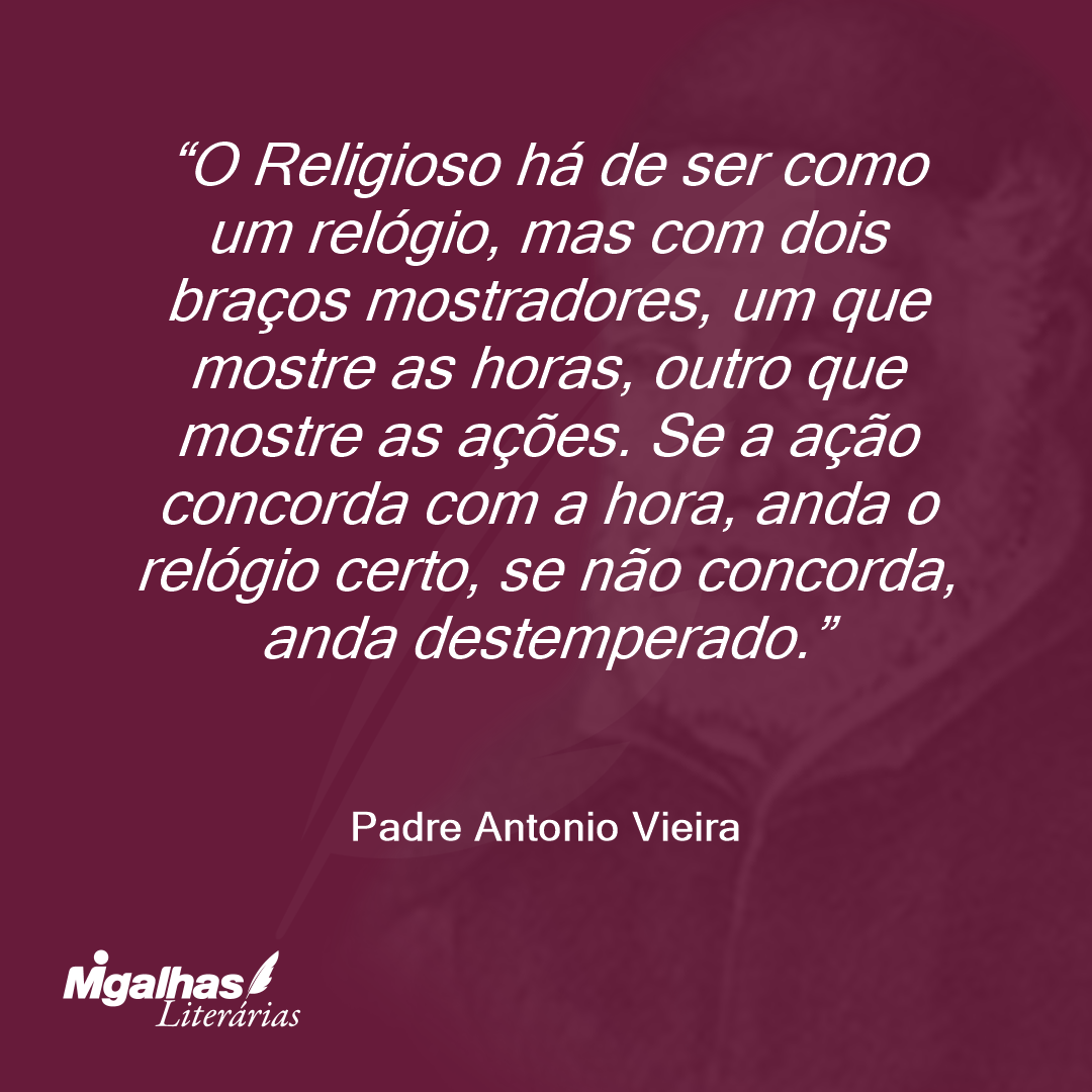 O Religioso há de ser como um relógio, mas com dois braços mostradores, um que mostre as horas, outro que mostre as ações. Se a ação concorda com a hora, anda o relógio certo, se não concorda, anda destemperado.