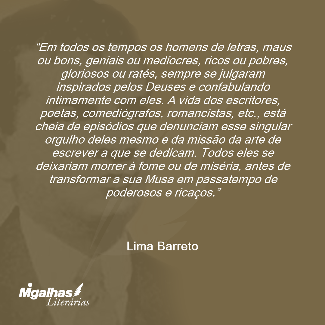 Em todos os tempos os homens de letras, maus ou bons, geniais ou medíocres, ricos ou pobres, gloriosos ou ratés, sempre se julgaram inspirados pelos Deuses e confabulando intimamente com eles. A vida dos escritores, poetas, comediógrafos, romancistas, etc., está cheia de episódios que denunciam esse singular orgulho deles mesmo e da missão da arte de escrever a que se dedicam. Todos eles se deixariam morrer à fome ou de miséria, antes de transformar a sua Musa em passatempo de poderosos e ricaços.