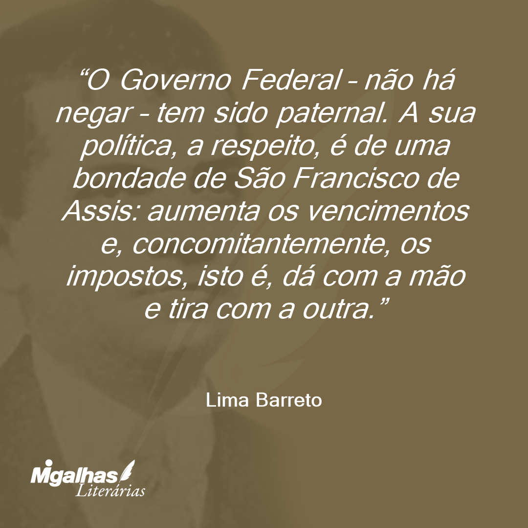 O Governo Federal – não há negar – tem sido paternal. A sua política, a respeito, é de uma bondade de São Francisco de Assis: aumenta os vencimentos e, concomitantemente, os impostos, isto é, dá com a mão e tira com a outra.