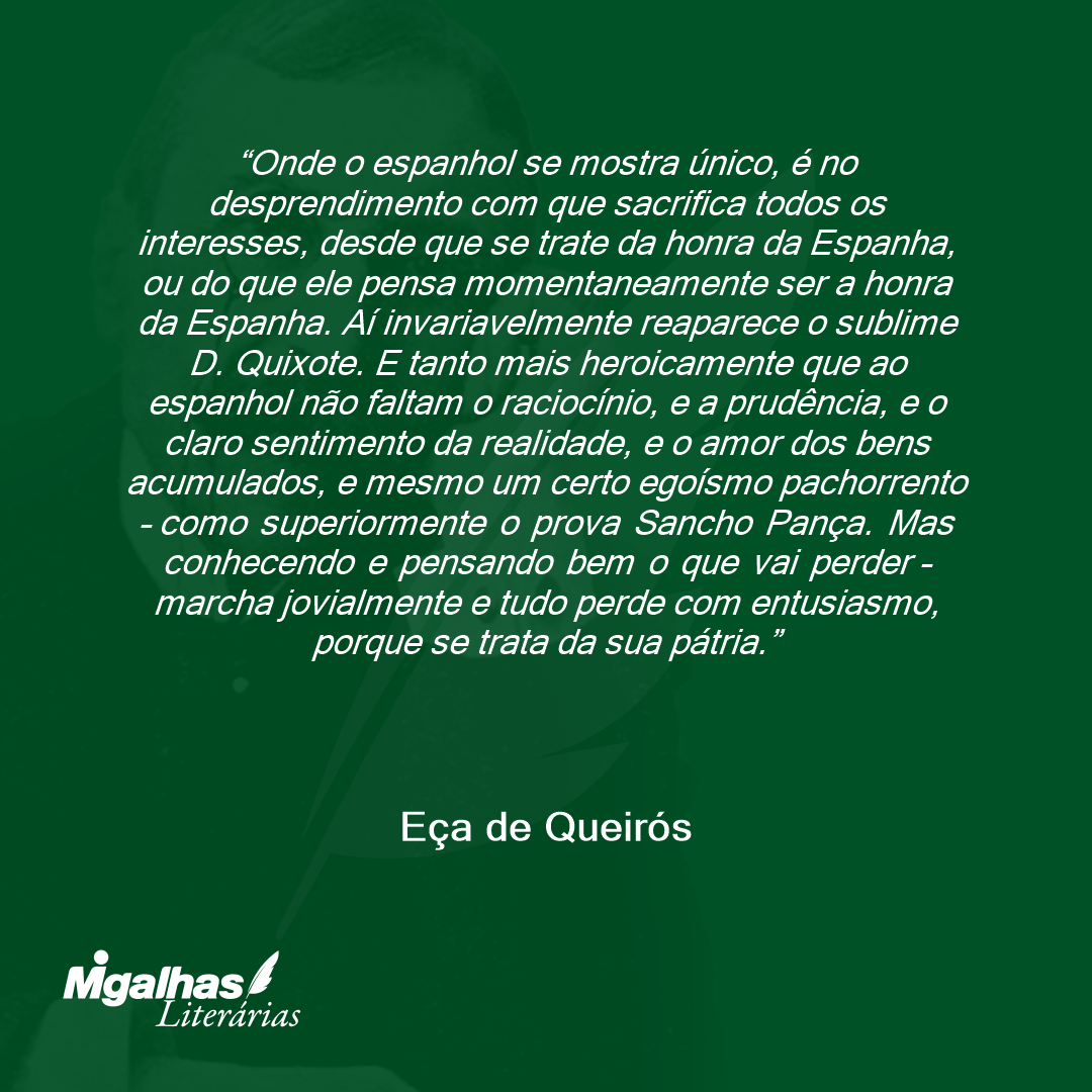 Onde o espanhol se mostra único, é no desprendimento com que sacrifica todos os interesses, desde que se trate da honra da Espanha, ou do que ele pensa momentaneamente ser a honra da Espanha. Aí invariavelmente reaparece o sublime D. Quixote. E tanto mais heroicamente que ao espanhol não faltam o raciocínio, e a prudência, e o claro sentimento da realidade, e o amor dos bens acumulados, e mesmo um certo egoísmo pachorrento – como superiormente o prova Sancho Pança. Mas conhecendo e pensando bem o que vai perder – marcha jovialmente e tudo perde com entusiasmo, porque se trata da sua pátria.