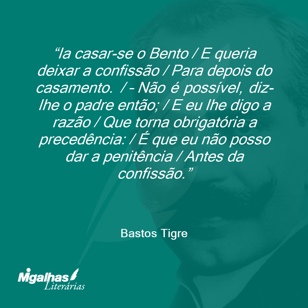 Ia casar-se o Bento / E queria deixar a confissão / Para depois do casamento. / – Não é possível, diz-lhe o padre então; / E eu lhe digo a razão / Que torna obrigatória a precedência: / É que eu não posso dar a penitência / Antes da confissão.