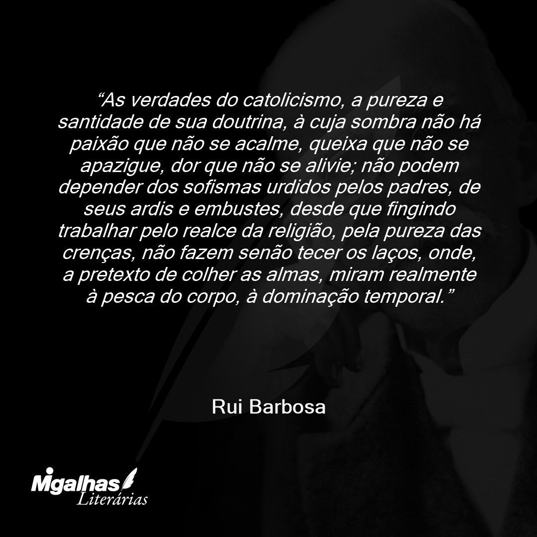 As verdades do catolicismo, a pureza e santidade de sua doutrina, à cuja sombra não há paixão que não se acalme, queixa que não se apazigue, dor que não se alivie; não podem depender dos sofismas urdidos pelos padres, de seus ardis e embustes, desde que fingindo trabalhar pelo realce da religião, pela pureza das crenças, não fazem senão tecer os laços, onde, a pretexto de colher as almas, miram realmente à pesca do corpo, à dominação temporal.