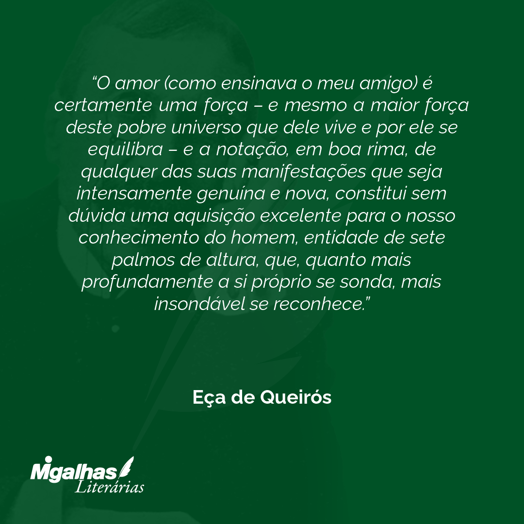 O amor (como ensinava o meu amigo) é certamente uma força – e mesmo a maior força deste pobre universo que dele vive e por ele se equilibra – e a notação, em boa rima, de qualquer das suas manifestações que seja intensamente genuína e nova, constitui sem dúvida uma aquisição excelente para o nosso conhecimento do homem, entidade de sete palmos de altura, que, quanto mais profundamente a si próprio se sonda, mais insondável se reconhece.