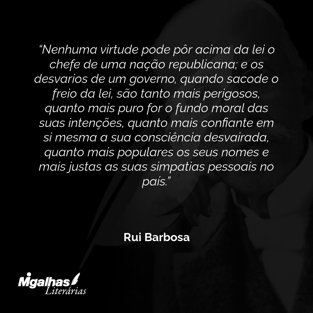 Nenhuma virtude pode pôr acima da lei o chefe de uma nação republicana; e os desvarios de um governo, quando sacode o freio da lei, são tanto mais perigosos, quanto mais puro for o fundo moral das suas intenções, quanto mais confiante em si mesma a sua consciência desvairada, quanto mais populares os seus nomes e mais justas as suas simpatias pessoais no país.