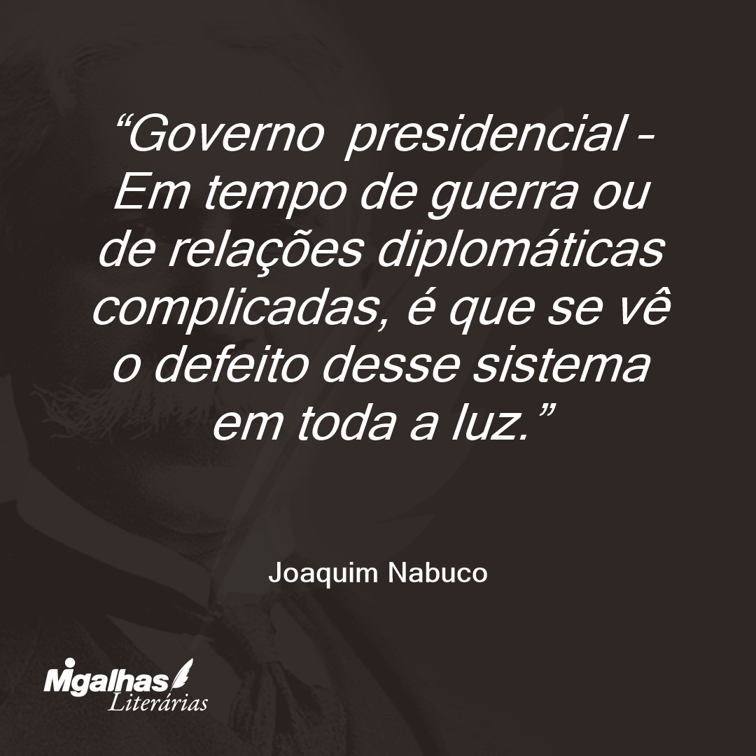 Governo presidencial – Em tempo de guerra ou de relações diplomáticas complicadas, é que se vê o defeito desse sistema em toda a luz.