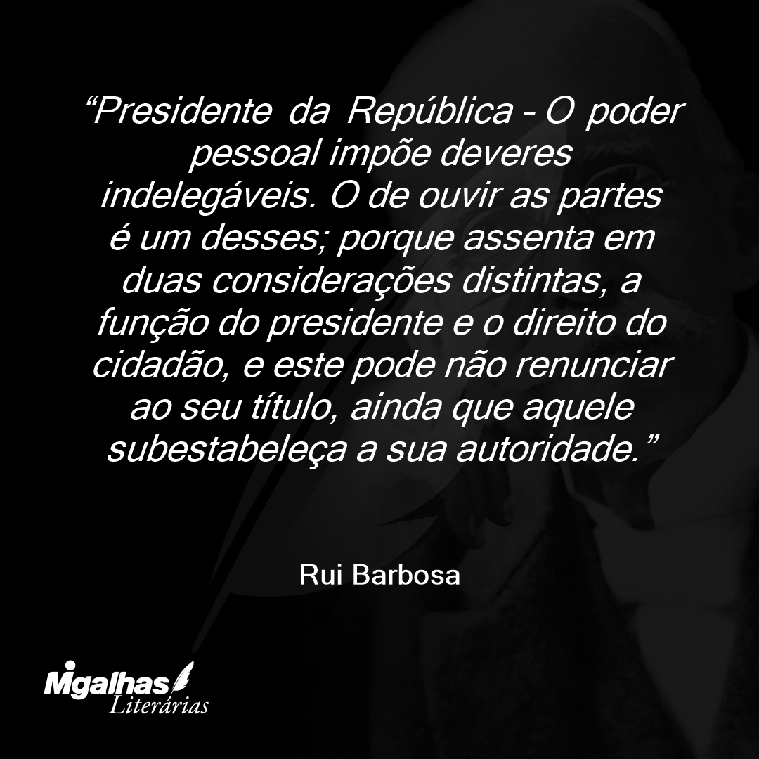 Presidente da República – O poder pessoal impõe deveres indelegáveis. O de ouvir as partes é um desses; porque assenta em duas considerações distintas, a função do presidente e o direito do cidadão, e este pode não renunciar ao seu título, ainda que aquele subestabeleça a sua autoridade.