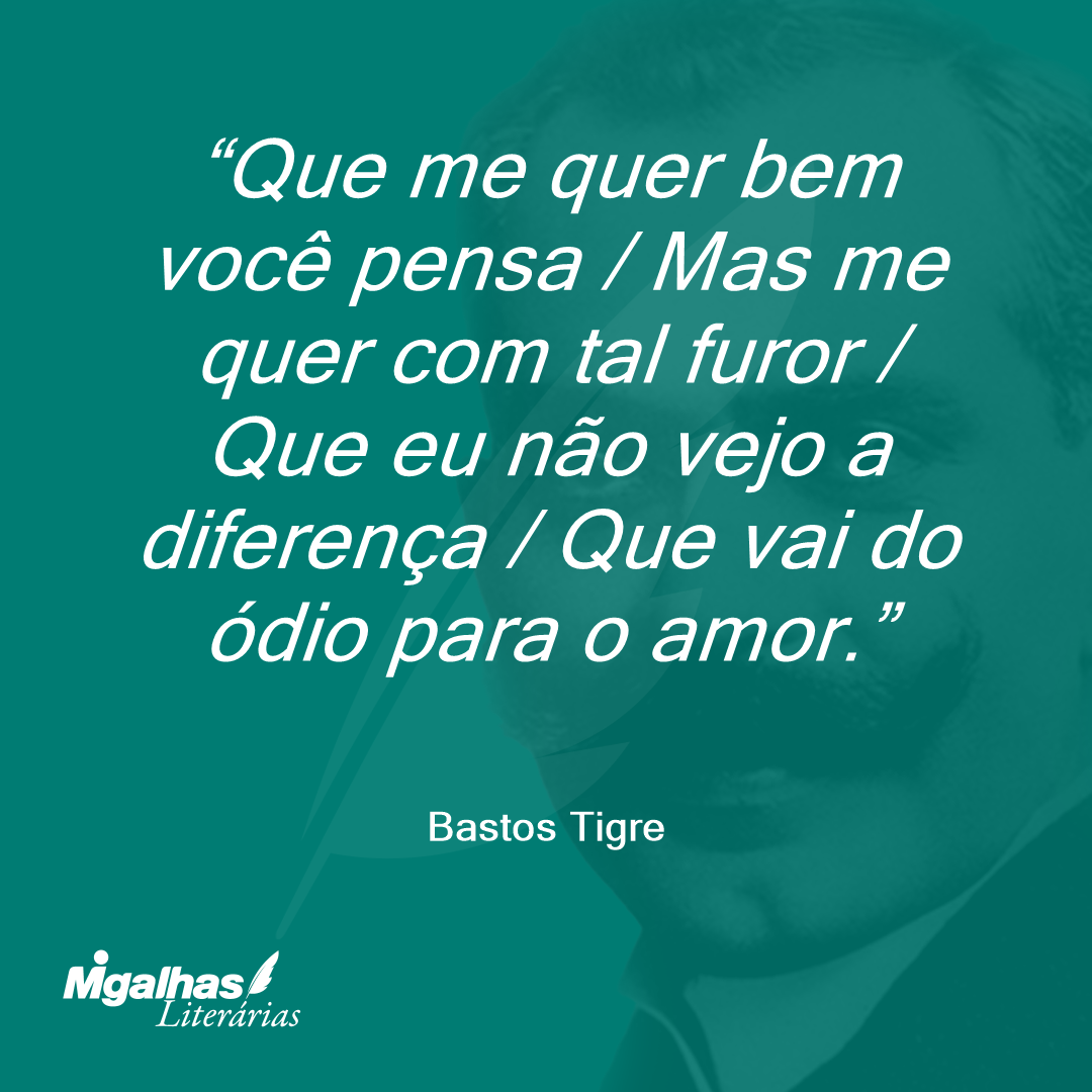 Que me quer bem você pensa / Mas me quer com tal furor / Que eu não vejo a diferença / Que vai do ódio para o amor.