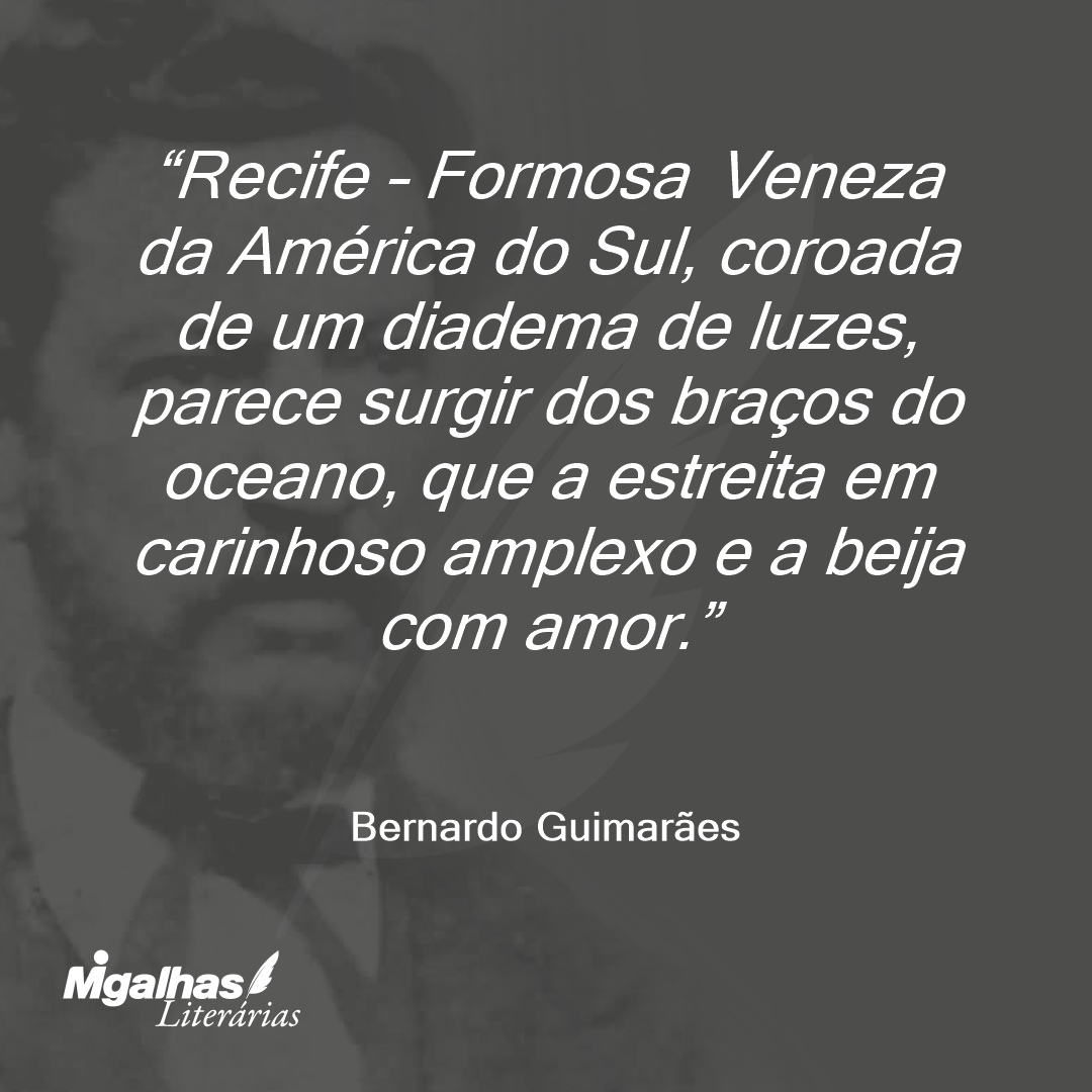 O Rio de Janeiro é sem dúvida superior na majestade da natureza; o Recife porém prima pela graça e louçania. A nossa corte parece uma rainha altiva em seu trono de montanhas; a capital de Pernambuco será a princesa gentil que se debruça sobre as ondas dentre as moitas de seus jardins.