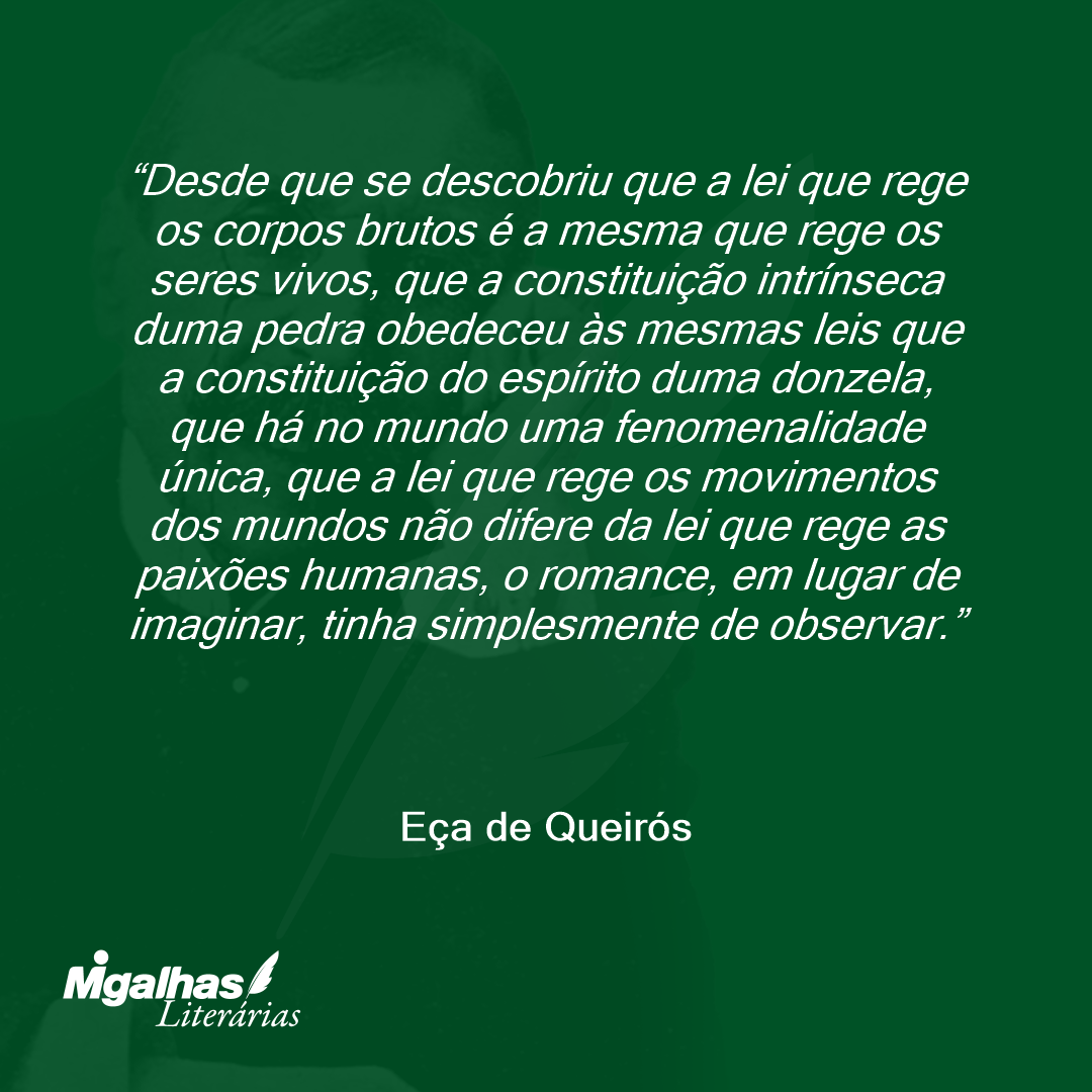 Desde que se descobriu que a lei que rege os corpos brutos é a mesma que rege os seres vivos, que a constituição intrínseca duma pedra obedeceu às mesmas leis que a constituição do espírito duma donzela, que há no mundo uma fenomenalidade única, que a lei que rege os movimentos dos mundos não difere da lei que rege as paixões humanas, o romance, em lugar de imaginar, tinha simplesmente de observar.