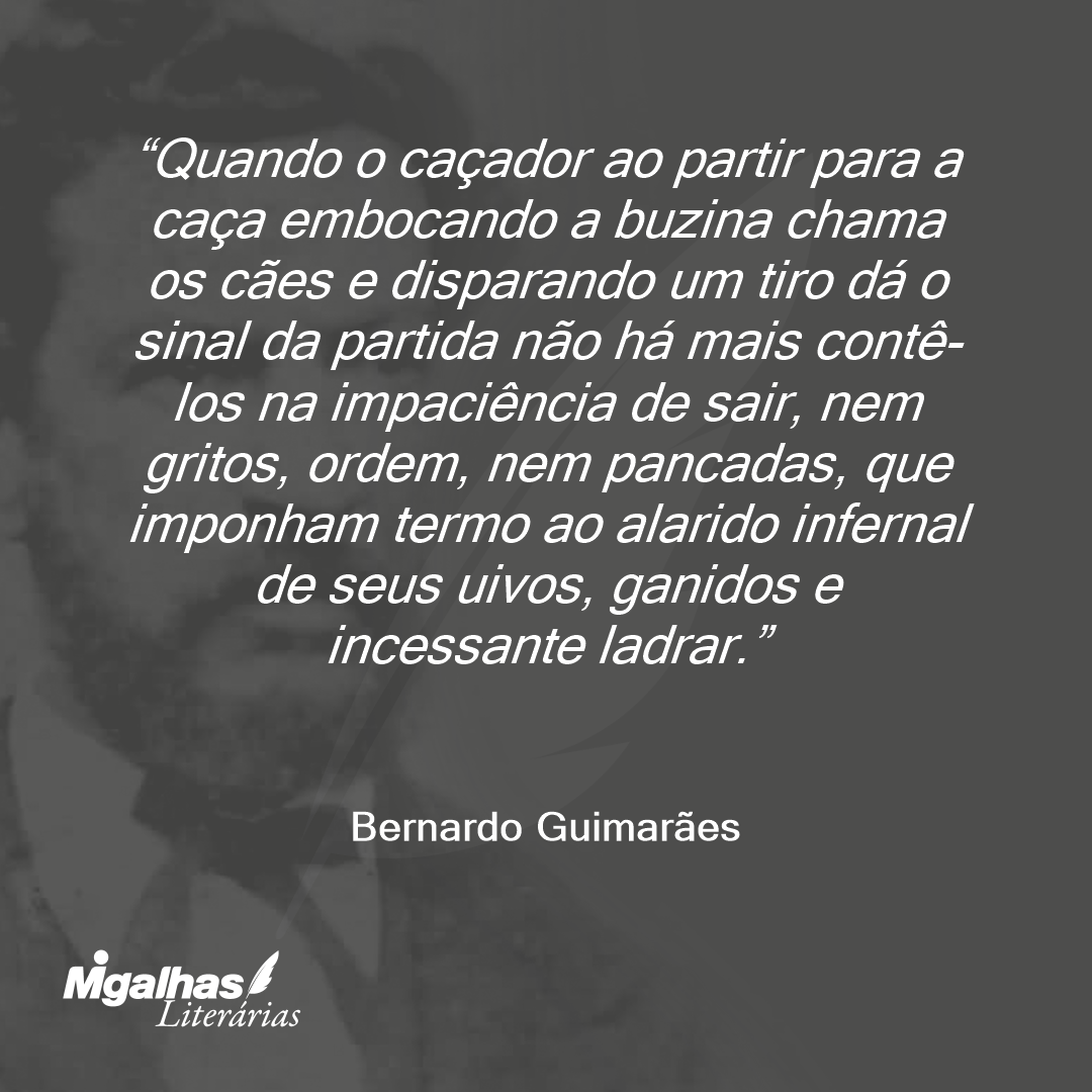 Quando o caçador ao partir para a caça embocando a buzina chama os cães e disparando um tiro dá o sinal da partida não há mais contê-los na impaciência de sair, nem gritos, ordem, nem pancadas, que imponham termo ao alarido infernal de seus uivos, ganidos e incessante ladrar.