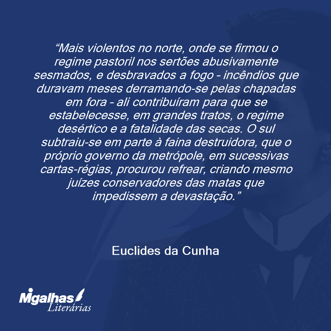 Mais violentos no norte, onde se firmou o regime pastoril nos sertões abusivamente sesmados, e desbravados a fogo – incêndios que duravam meses derramando-se pelas chapadas em fora – ali contribuíram para que se estabelecesse, em grandes tratos, o regime desértico e a fatalidade das secas. O sul subtraiu-se em parte à faina destruidora, que o próprio governo da metrópole, em sucessivas cartas-régias, procurou refrear, criando mesmo juízes conservadores das matas que impedissem a devastação.