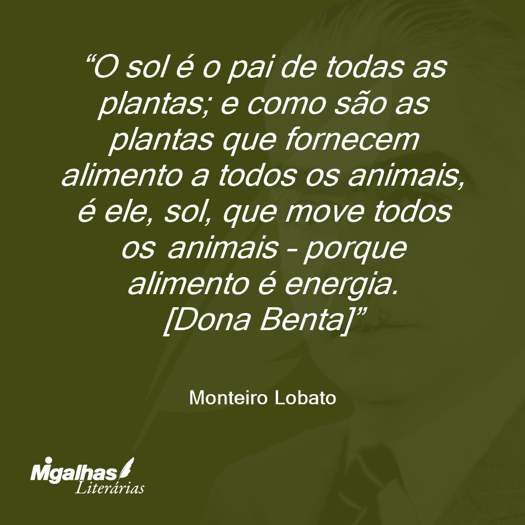 O sol é o pai de todas as plantas; e como são as plantas que fornecem alimento a todos os animais, é ele, sol, que move todos os animais – porque alimento é energia. [Dona Benta]