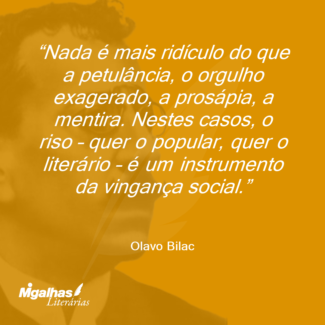 Nada é mais ridículo do que a petulância, o orgulho exagerado, a prosápia, a mentira. Nestes casos, o riso – quer o popular, quer o literário – é um instrumento da vingança social.