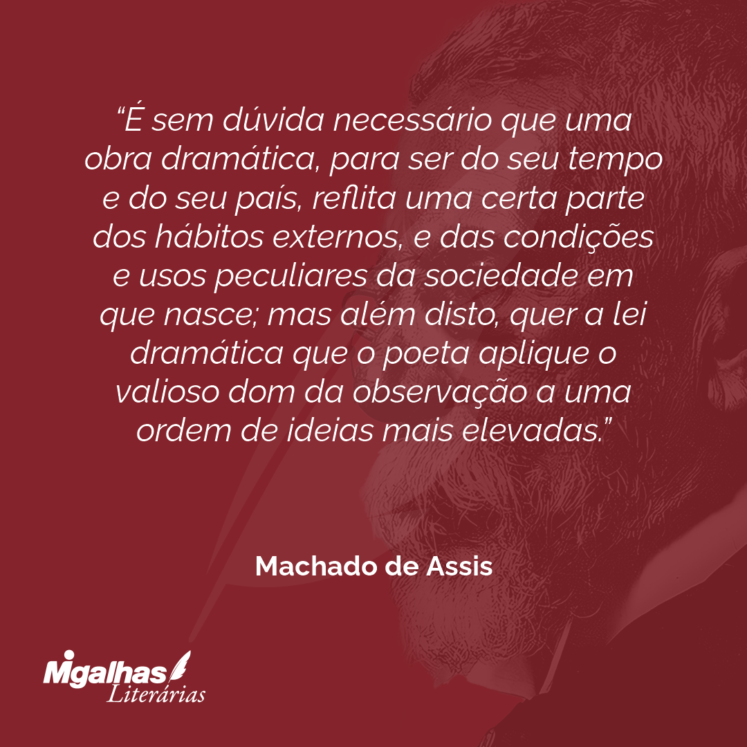 É sem dúvida necessário que uma obra dramática, para ser do seu tempo e do seu país, reflita uma certa parte dos hábitos externos, e das condições e usos peculiares da sociedade em que nasce; mas além disto, quer a lei dramática que o poeta aplique o valioso dom da observação a uma ordem de ideias mais elevadas.
