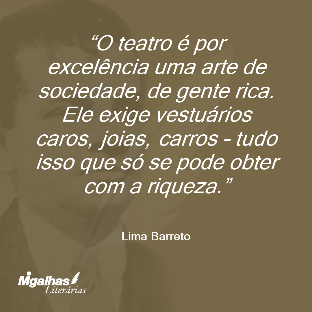O teatro é por excelência uma arte de sociedade, de gente rica. Ele exige vestuários caros, joias, carros – tudo isso que só se pode obter com a riqueza.