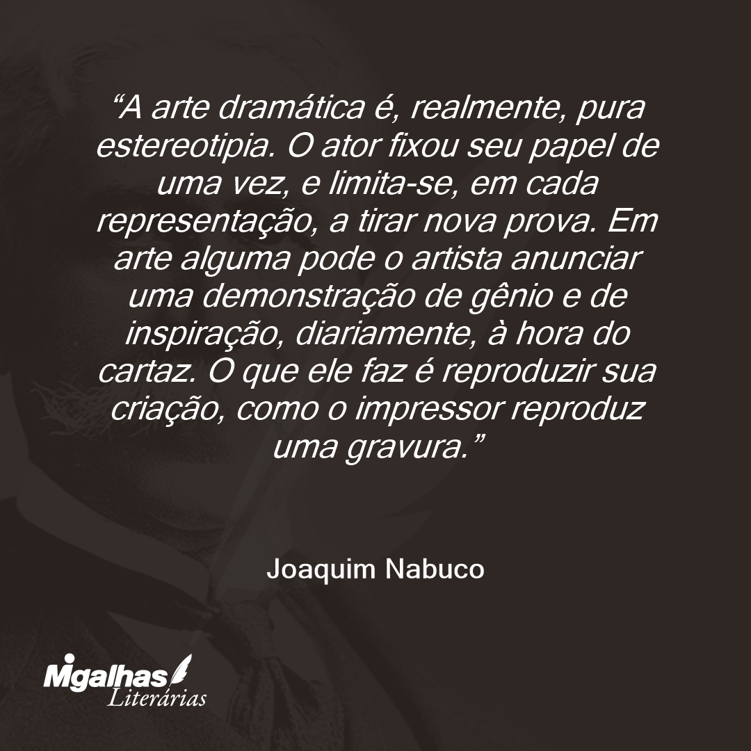 A arte dramática é, realmente, pura estereotipia. O ator fixou seu papel de uma vez, e limita-se, em cada representação, a tirar nova prova. Em arte alguma pode o artista anunciar uma demonstração de gênio e de inspiração, diariamente, à hora do cartaz. O que ele faz é reproduzir sua criação, como o impressor reproduz uma gravura.