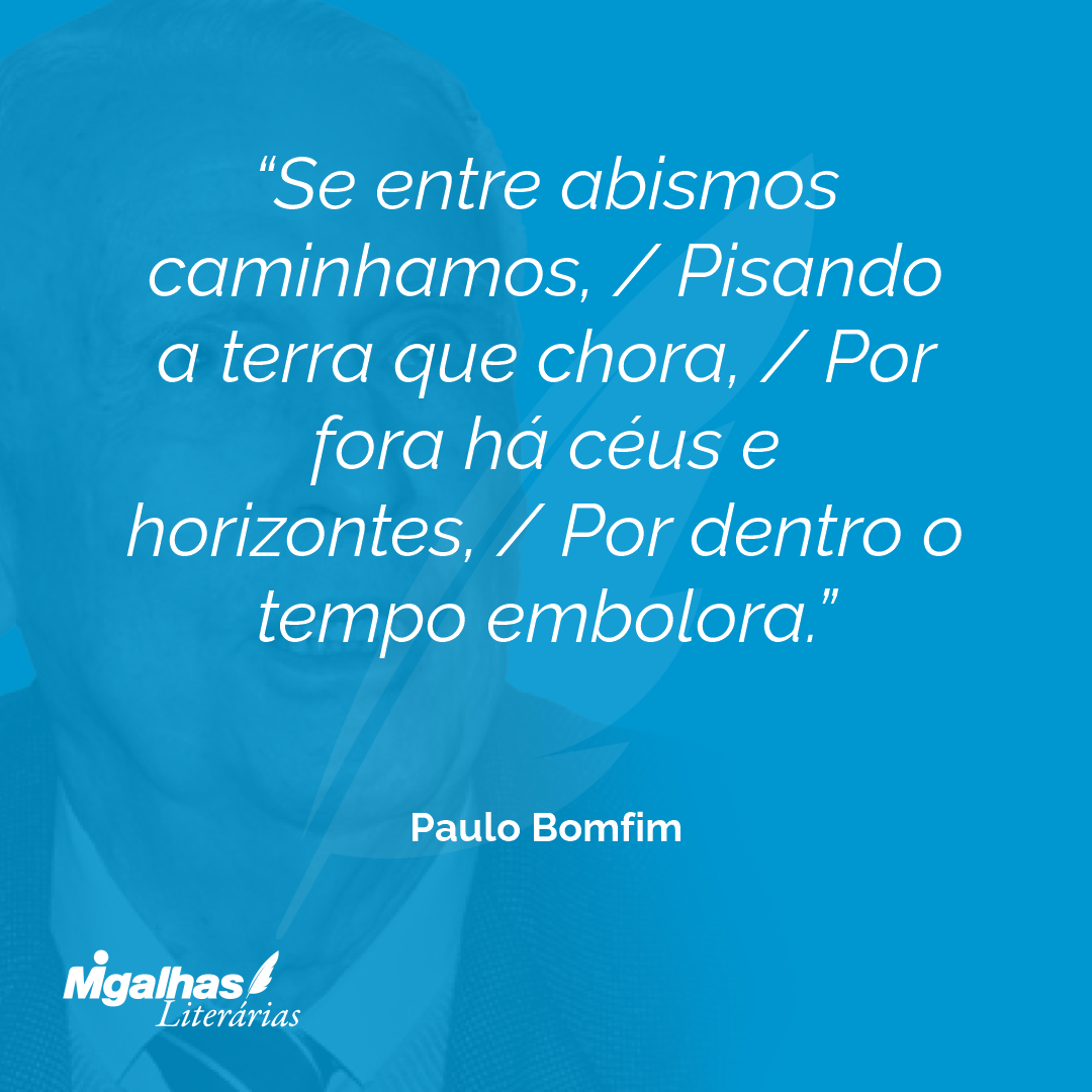 Se entre abismos caminhamos, / Pisando a terra que chora, / Por fora há céus e horizontes, / Por dentro o tempo embolora.