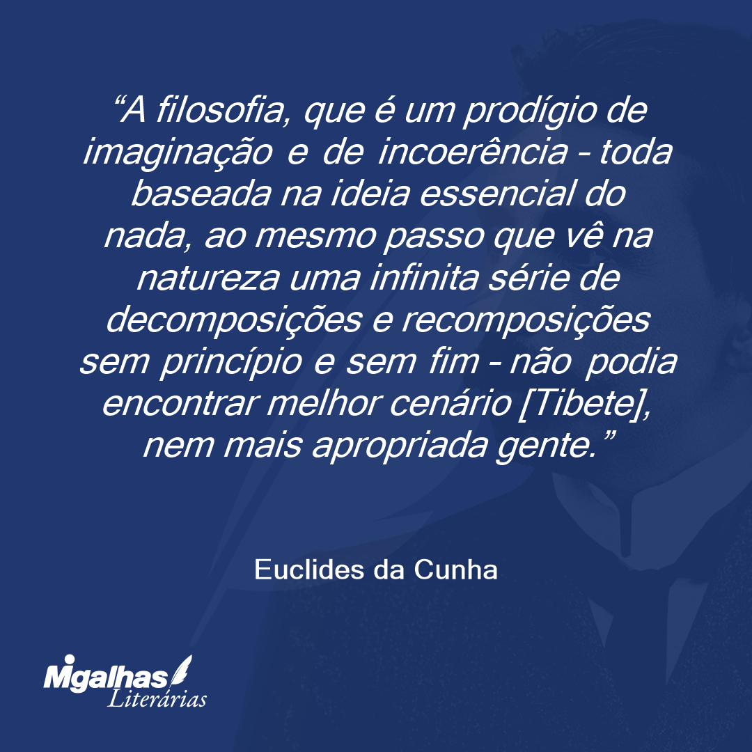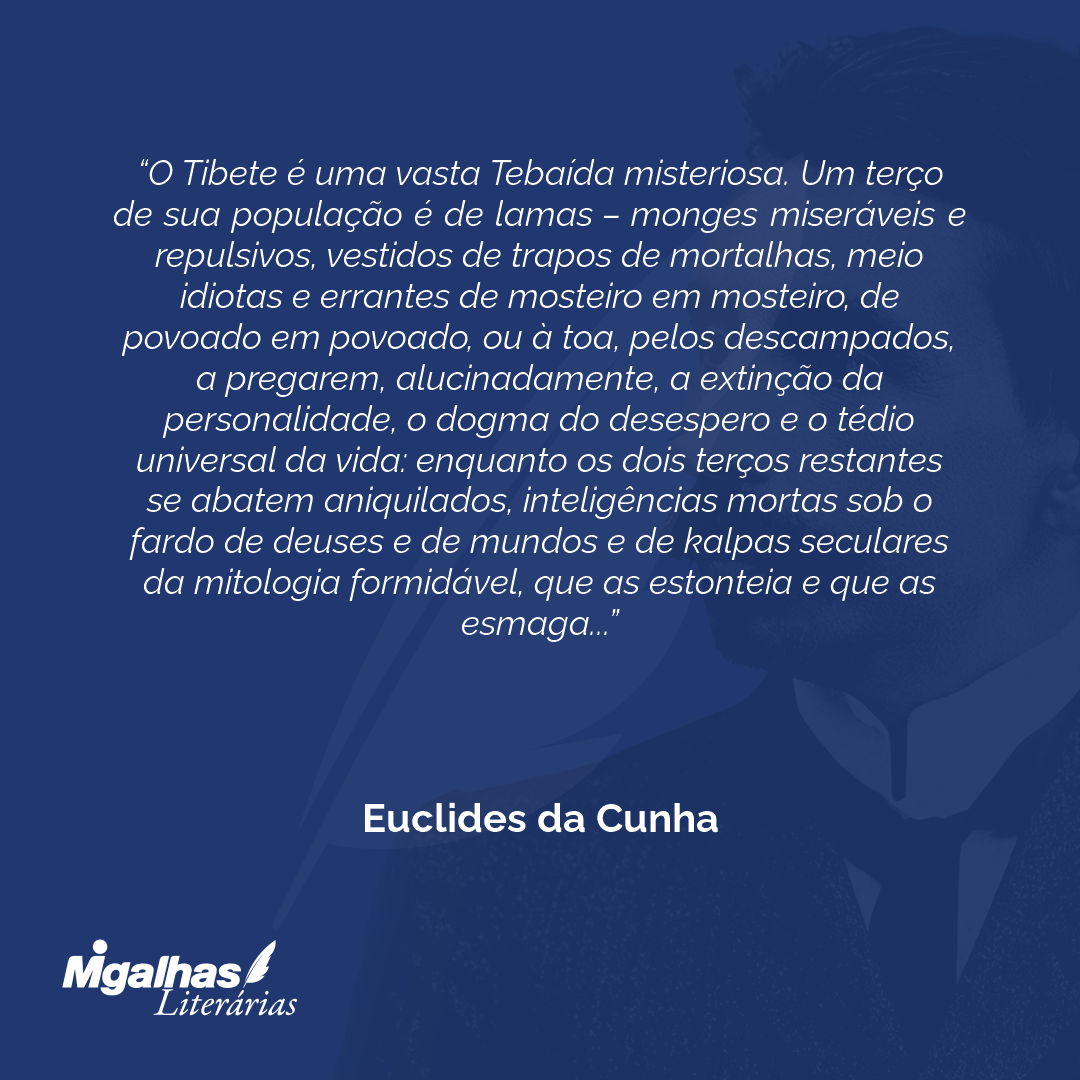O Tibete é uma vasta Tebaída misteriosa. Um terço de sua população é de lamas – monges miseráveis e repulsivos, vestidos de trapos de mortalhas, meio idiotas e errantes de mosteiro em mosteiro, de povoado em povoado, ou à toa, pelos descampados, a pregarem, alucinadamente, a extinção da personalidade, o dogma do desespero e o tédio universal da vida: enquanto os dois terços restantes se abatem aniquilados, inteligências mortas sob o fardo de deuses e de mundos e de kalpas seculares da mitologia formidável, que as estonteia e que as esmaga...