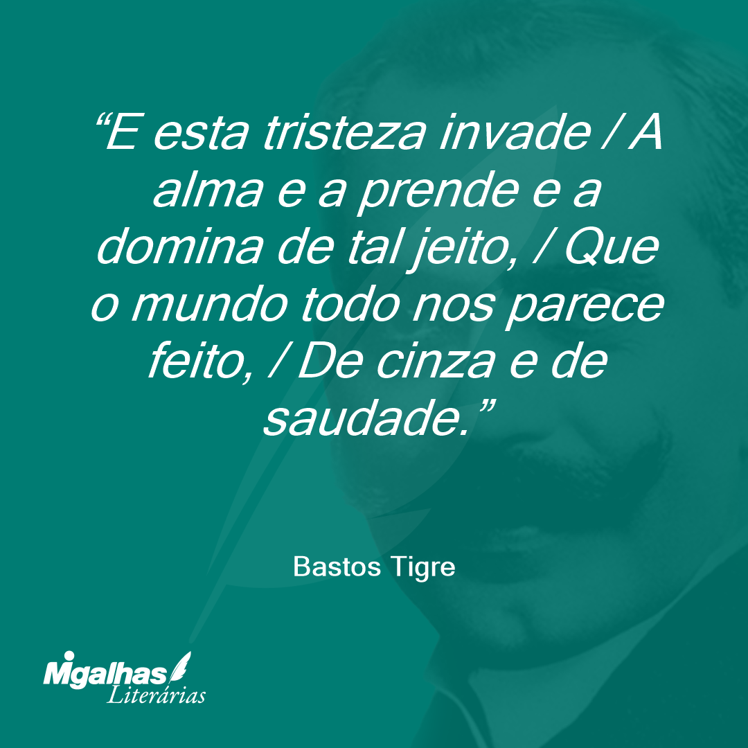 E esta tristeza invade / A alma e a prende e a domina de tal jeito, / Que o mundo todo nos parece feito, / De cinza e de saudade.