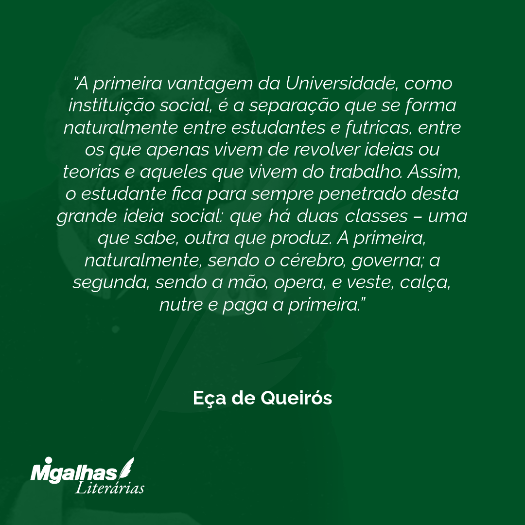 A primeira vantagem da Universidade, como instituição social, é a separação que se forma naturalmente entre estudantes e futricas, entre os que apenas vivem de revolver ideias ou teorias e aqueles que vivem do trabalho. Assim, o estudante fica para sempre penetrado desta grande ideia social: que há duas classes – uma que sabe, outra que produz. A primeira, naturalmente, sendo o cérebro, governa; a segunda, sendo a mão, opera, e veste, calça, nutre e paga a primeira.