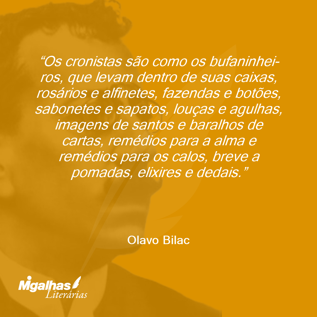 Os cronistas são como os bufaninhei-ros, que levam dentro de suas caixas, rosários e alfinetes, fazendas e botões, sabonetes e sapatos, louças e agulhas, imagens de santos e baralhos de cartas, remédios para a alma e remédios para os calos, breve a pomadas, elixires e dedais.